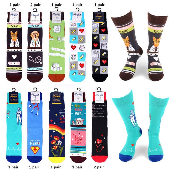 Men's Health Care Hero Socks. Material: 70% cotton, 29% polyester, 3% spandex Sock Size: 10-13 Shoe Size: 6-12.5
