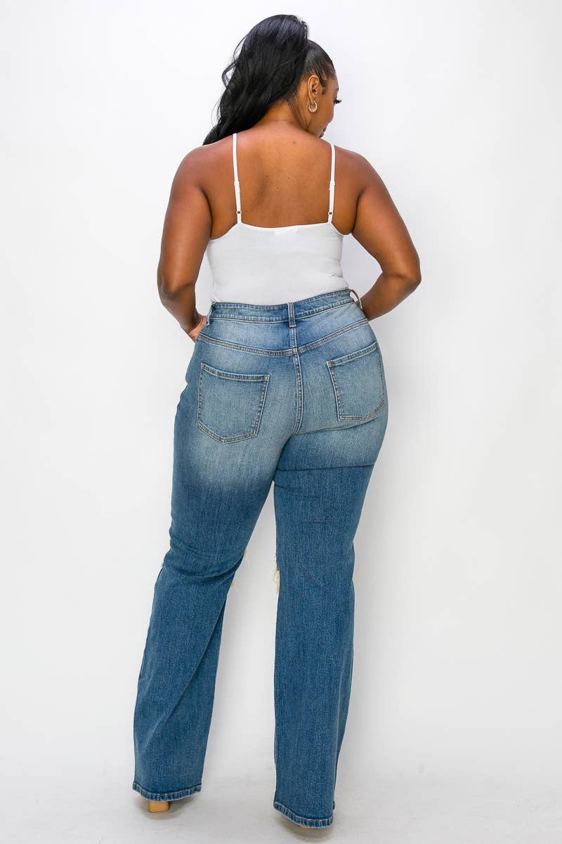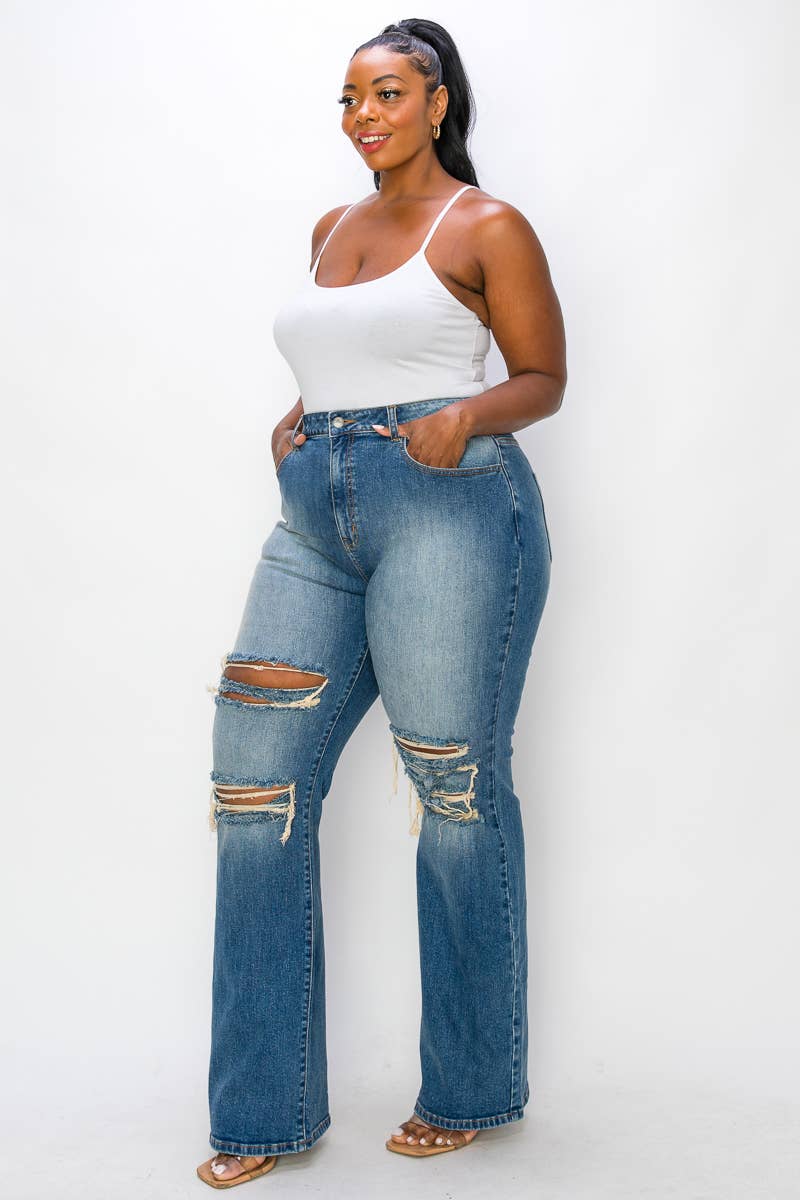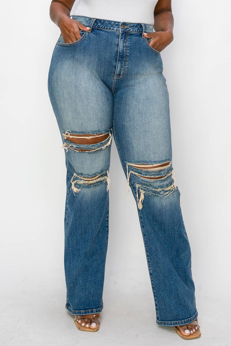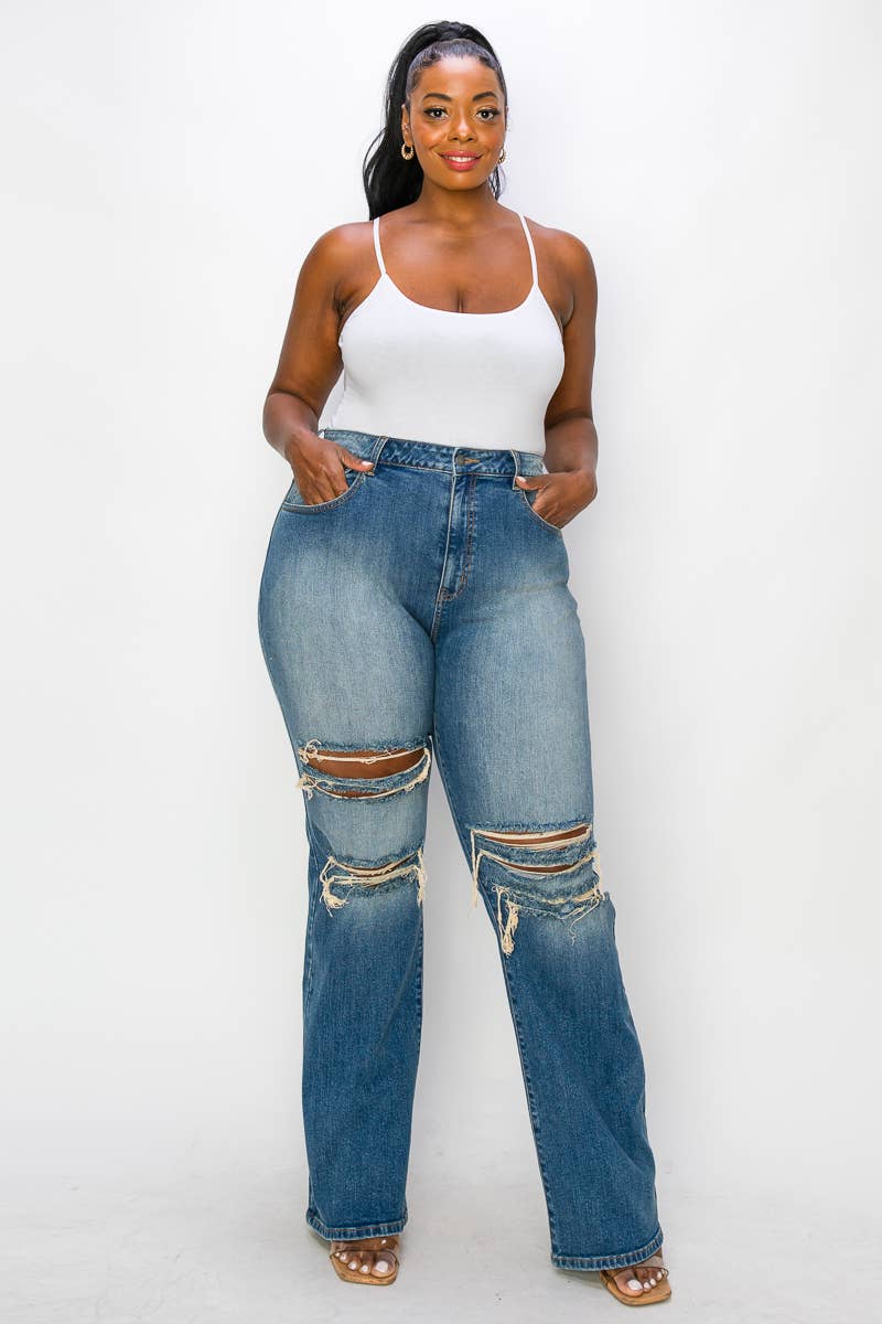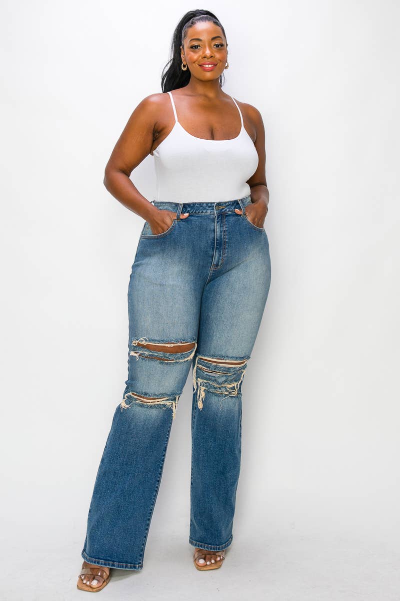 Elevate your denim game with our exclusive PLUS CURVY DISTRESSED VINTAGE WASH STRAIGHT LEG JEANS. Available in sizes 1XL-3XL, offers a relaxed fit from thighs to bottom, with a leg opening of 21" for added comfort. The fashionable front with gently destroyed details and easy front pockets add a touch of sophistication to these medium blue jeans. Made from a luxurious blend of 99% cotton and 1% spandex, these jeans are the epitome of high-end fashion.SIZE WAIST HIP FR RISE INSEAM 1XL 36" 46" 13 1/2" 33" 2XL 38" 48" 14" 33" 3XL 40" 50" 14 1/2" 33"