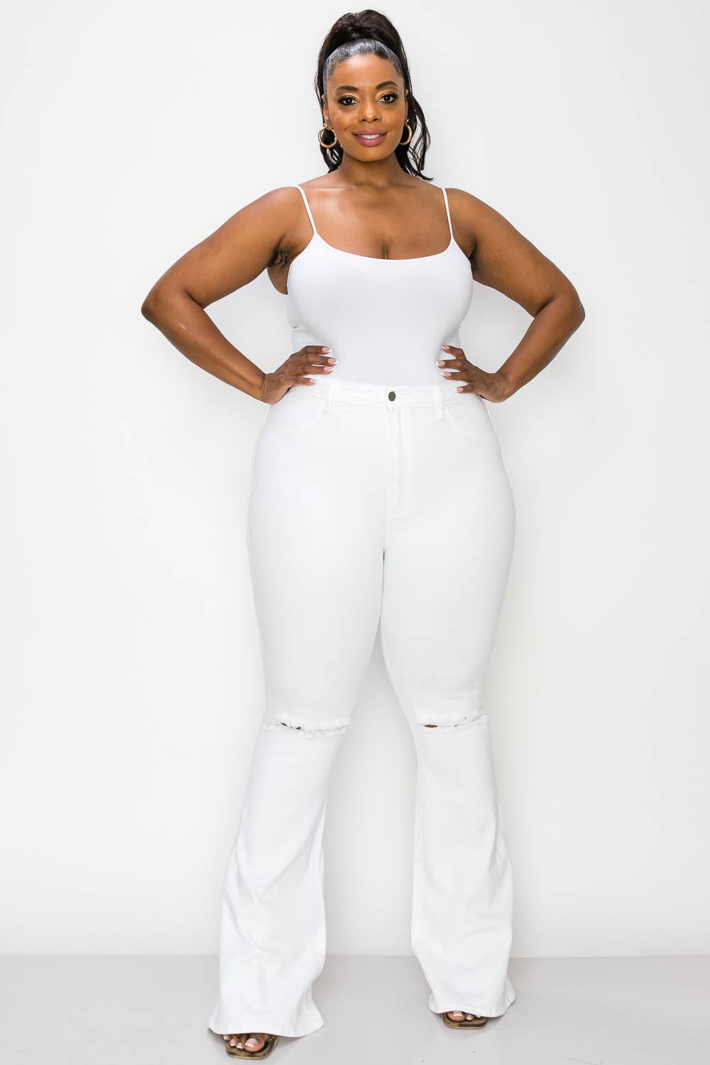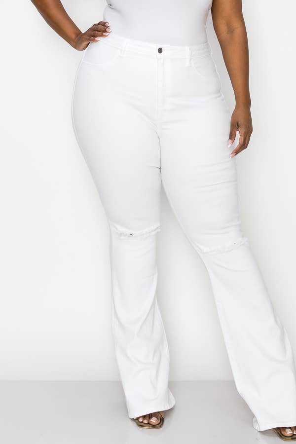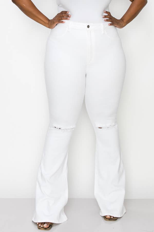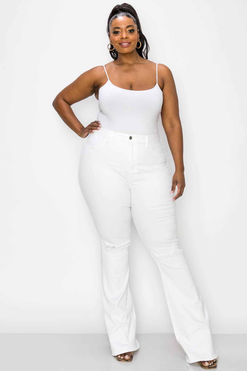 Introducing our exclusive PLUS CURVY FLARE WHITE JEANS, now available in three sizes: 1XL, 2XL, and 3XL. Featuring a unique KNEE CUT BLACK FLARE design with *FAKE FRONT POCKETS*, these jeans are crafted from a luxurious blend of 98% cotton and 2% spandex for the ultimate comfort and style. With a waist measurement of 33" for 1XL, 35" for 2XL, and 37" for 3XL, these jeans are designed to accentuate your curves. The hip measurements are 44" for 1XL, 46" for 2XL, and 48" for 3XL, while the front rise measures 13 1/4" and the inseam is 34". Complete your look with a leg opening of 23" for the perfect fit. Elevate your wardrobe with our superior PLUS CURVY FLARE WHITE JEANS
