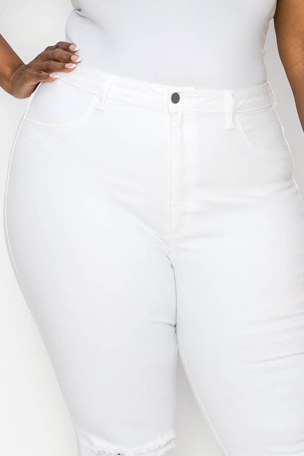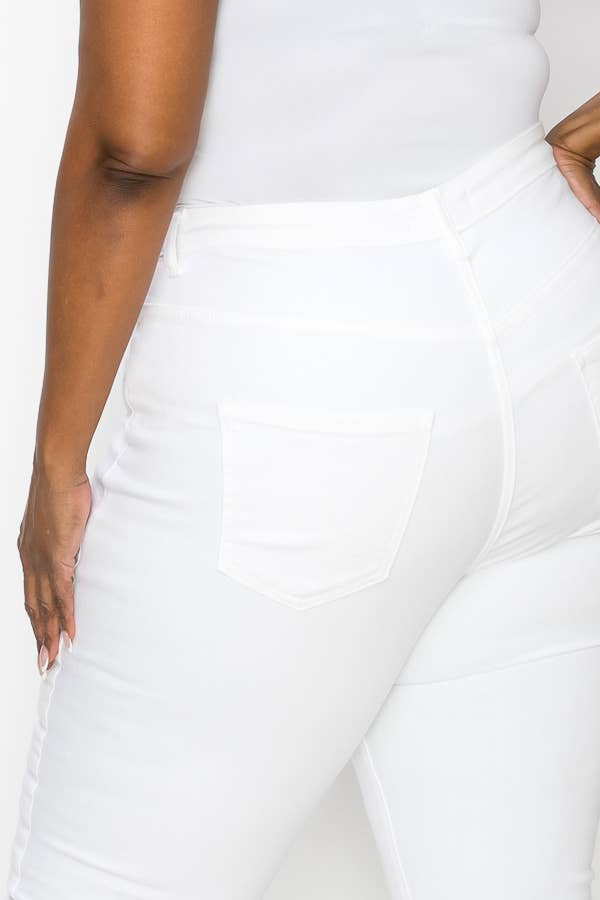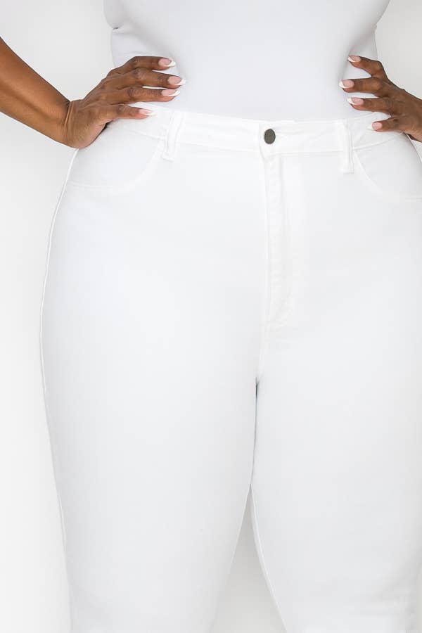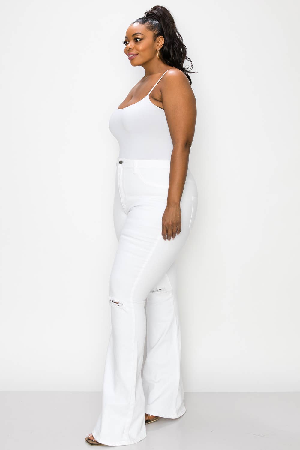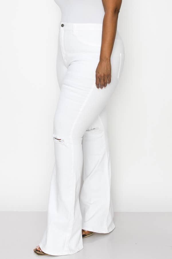 Introducing our exclusive PLUS CURVY FLARE WHITE JEANS, now available in three sizes: 1XL, 2XL, and 3XL. Featuring a unique KNEE CUT BLACK FLARE design with *FAKE FRONT POCKETS*, these jeans are crafted from a luxurious blend of 98% cotton and 2% spandex for the ultimate comfort and style. With a waist measurement of 33" for 1XL, 35" for 2XL, and 37" for 3XL, these jeans are designed to accentuate your curves. The hip measurements are 44" for 1XL, 46" for 2XL, and 48" for 3XL, while the front rise measures 13 1/4" and the inseam is 34". Complete your look with a leg opening of 23" for the perfect fit. Elevate your wardrobe with our superior PLUS CURVY FLARE WHITE JEANS