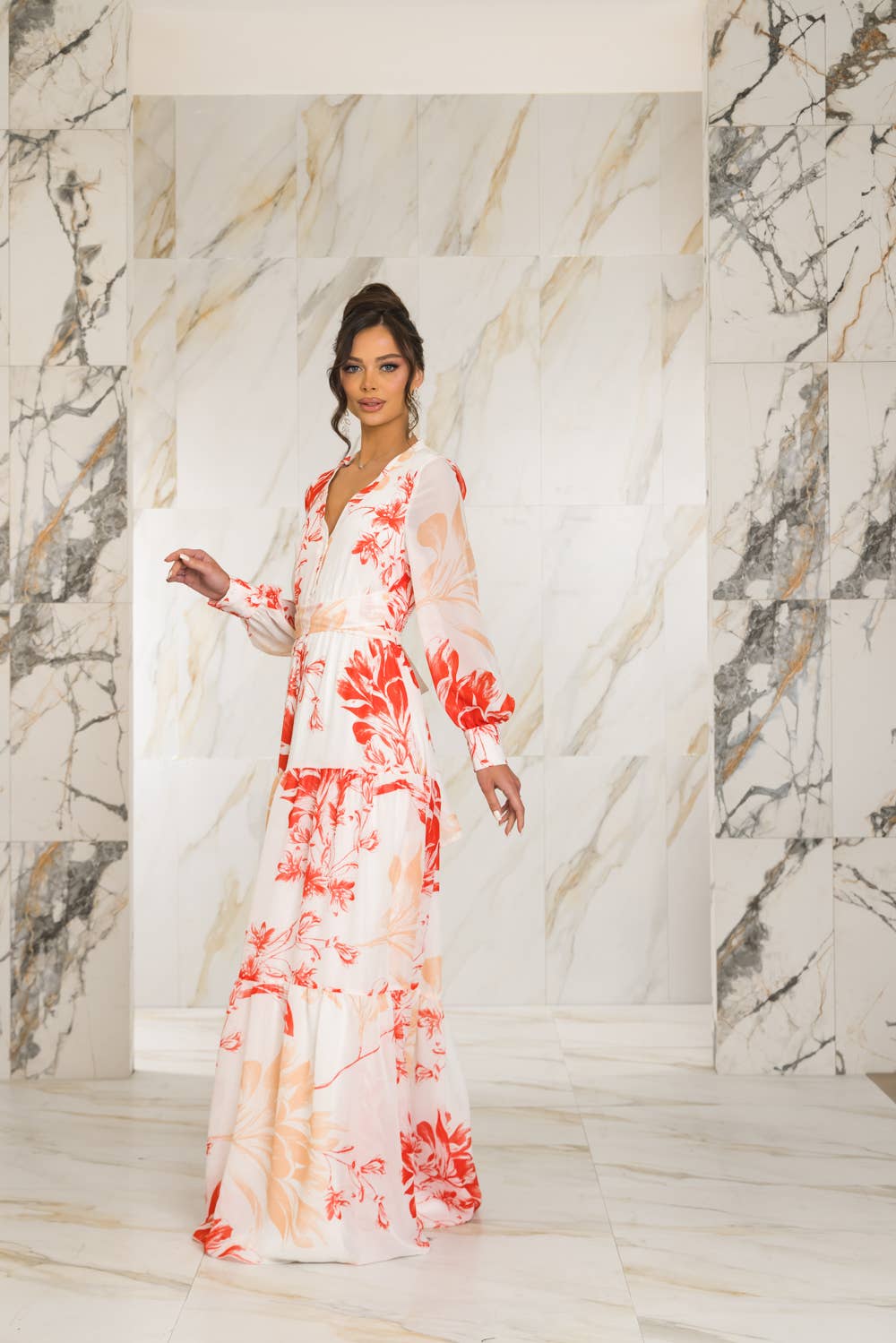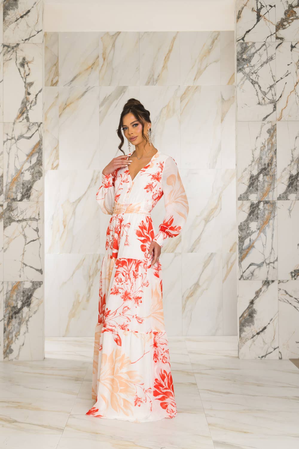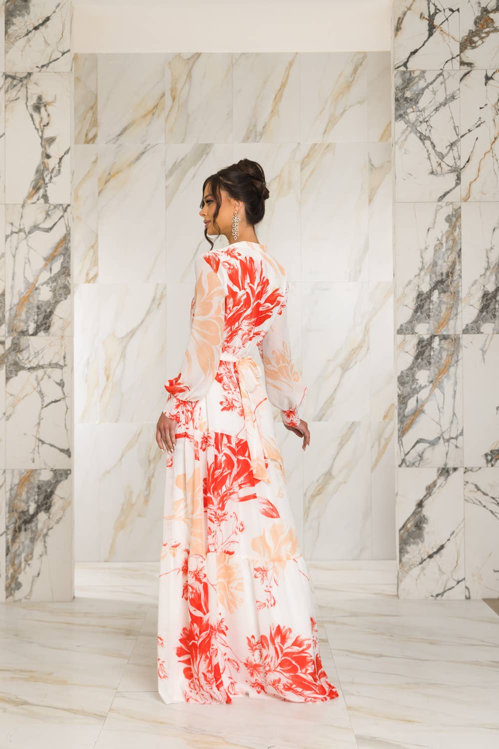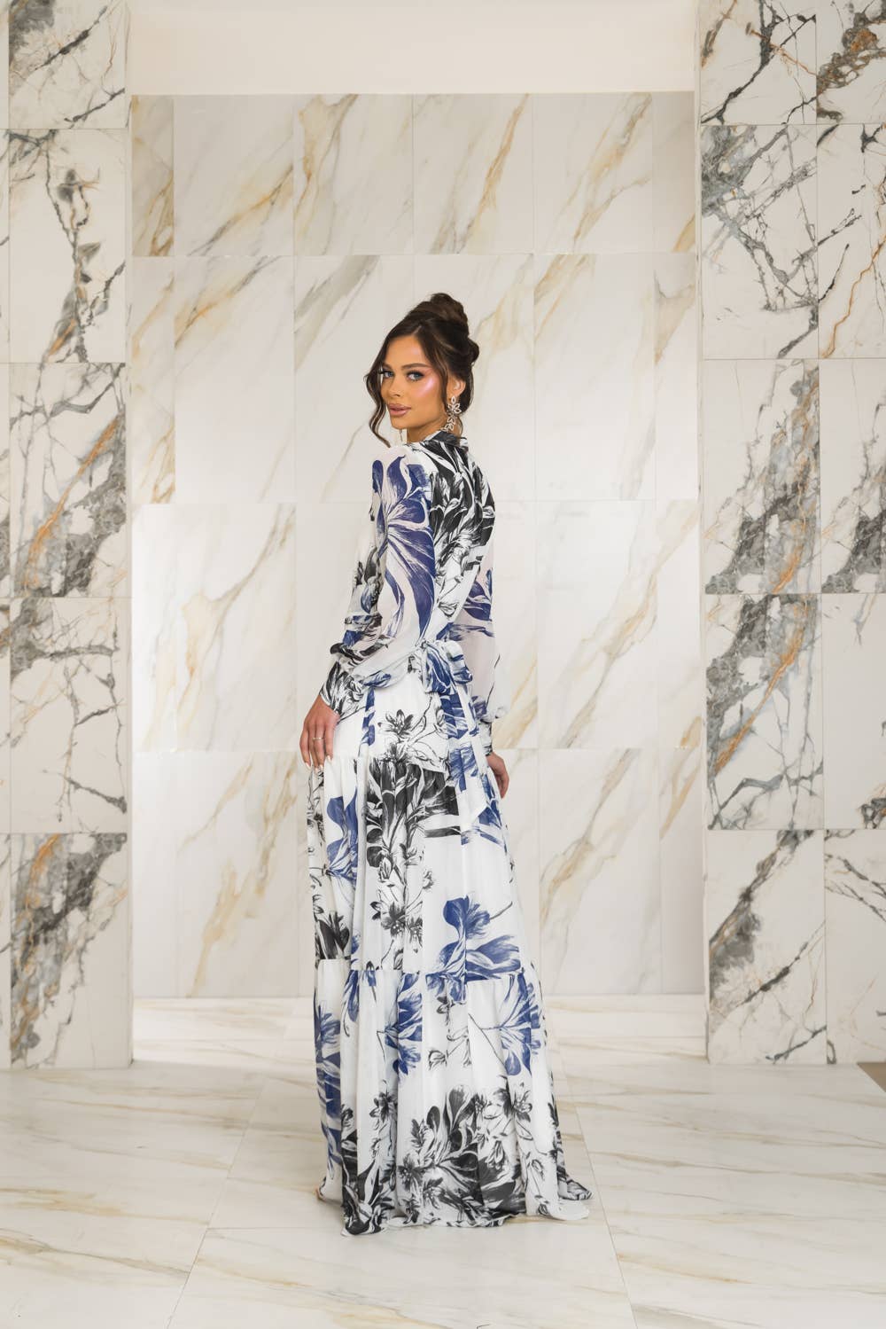 Floral print chiffon maxi dress featuring bishop sleeves. Surplice neck and multi-way waist tie. Button down dress. Fully lined on top & skirt. Bump friendly / Maternity. Total length 62" from HPS