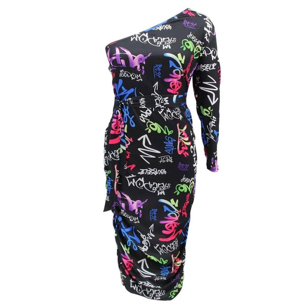 XL Plus Size Black and Multi Color Graffiti Print Asymmetric Neck One-Shoulder Ruched Midi Dress with Belt. Care Instructions: Hand wash or professional dry clean. 100% Polyester.