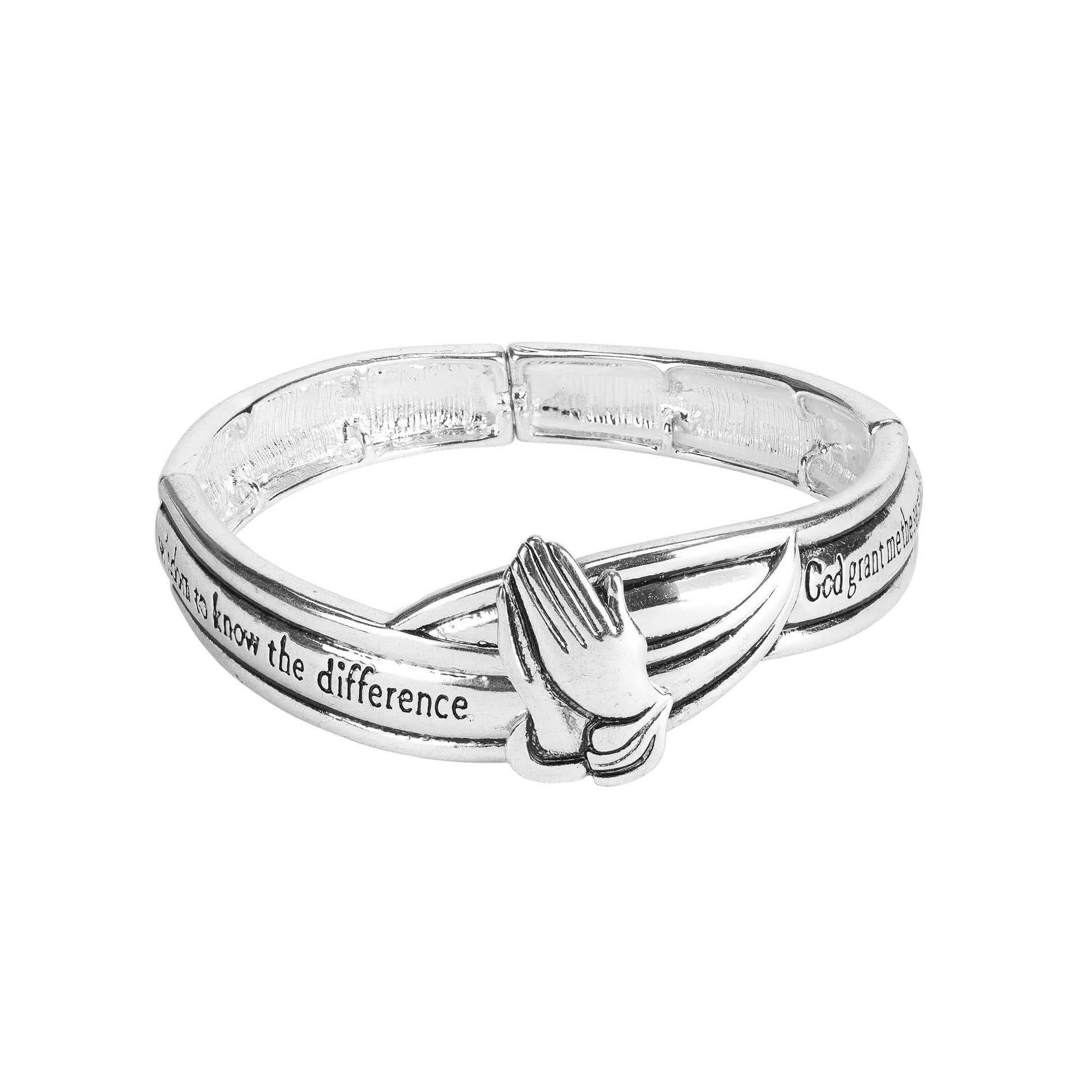 Introducing our exquisite four-tile Serenity Prayer bracelet, adorned with praying hands at the center and featuring unique stretch tile designs. Engraved over the tiles are words of wisdom, granting us serenity to accept the things we cannot change, courage to change what we can, and the wisdom to know the difference. Crafted with a silver plated finish, this bracelet boasts an inner diameter of 2 3/8 inches.