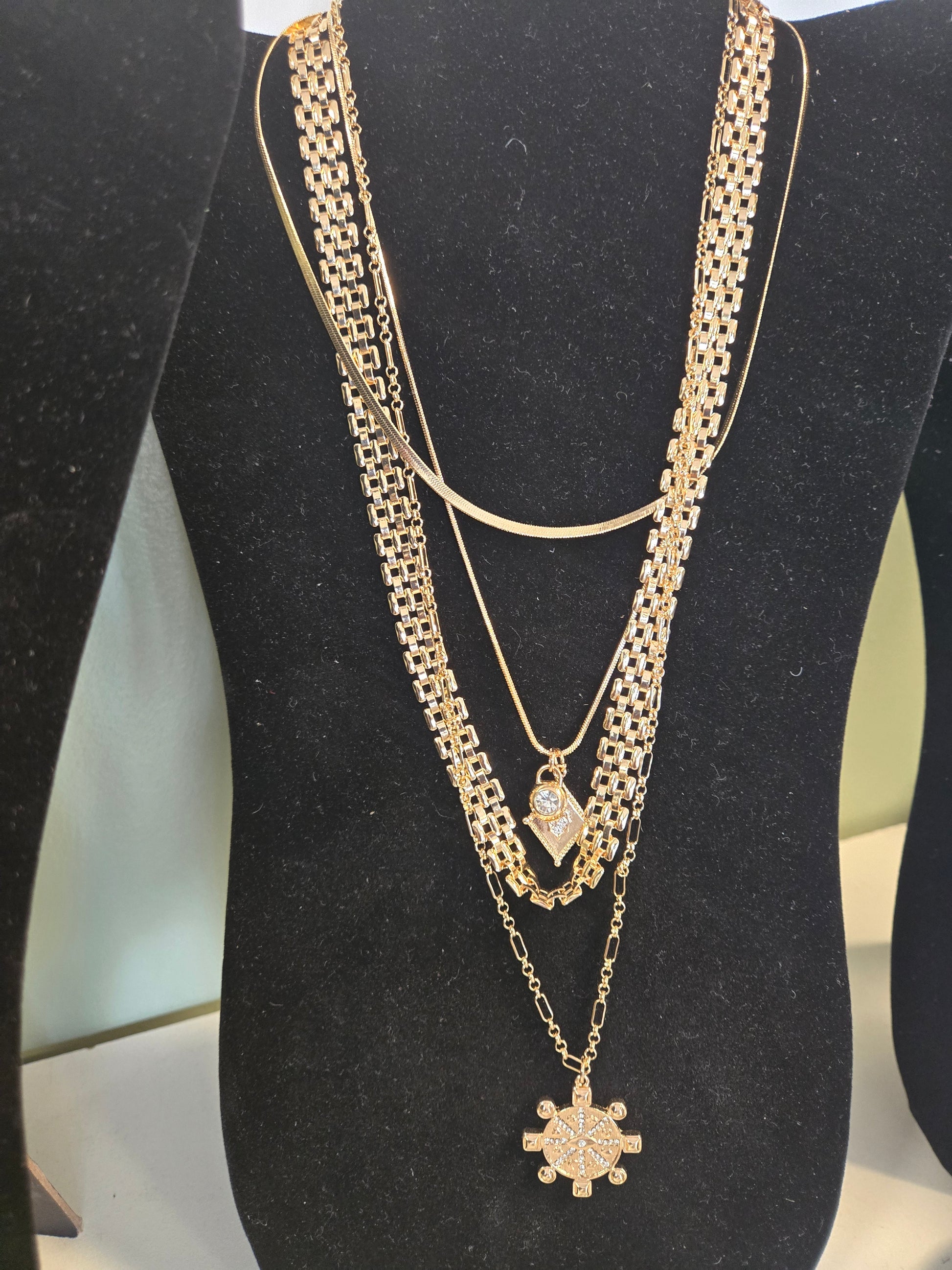 Brass metal ship wheel with pave crystal mixed charms and multi layered short chain necklace *Iron, Brass *Nickel/Lead Compliant *APPROX. L 16" + 17" + 21" + 24" Ext 3.25" Pendant Diamerter 1.25" 1.66oz *Imported