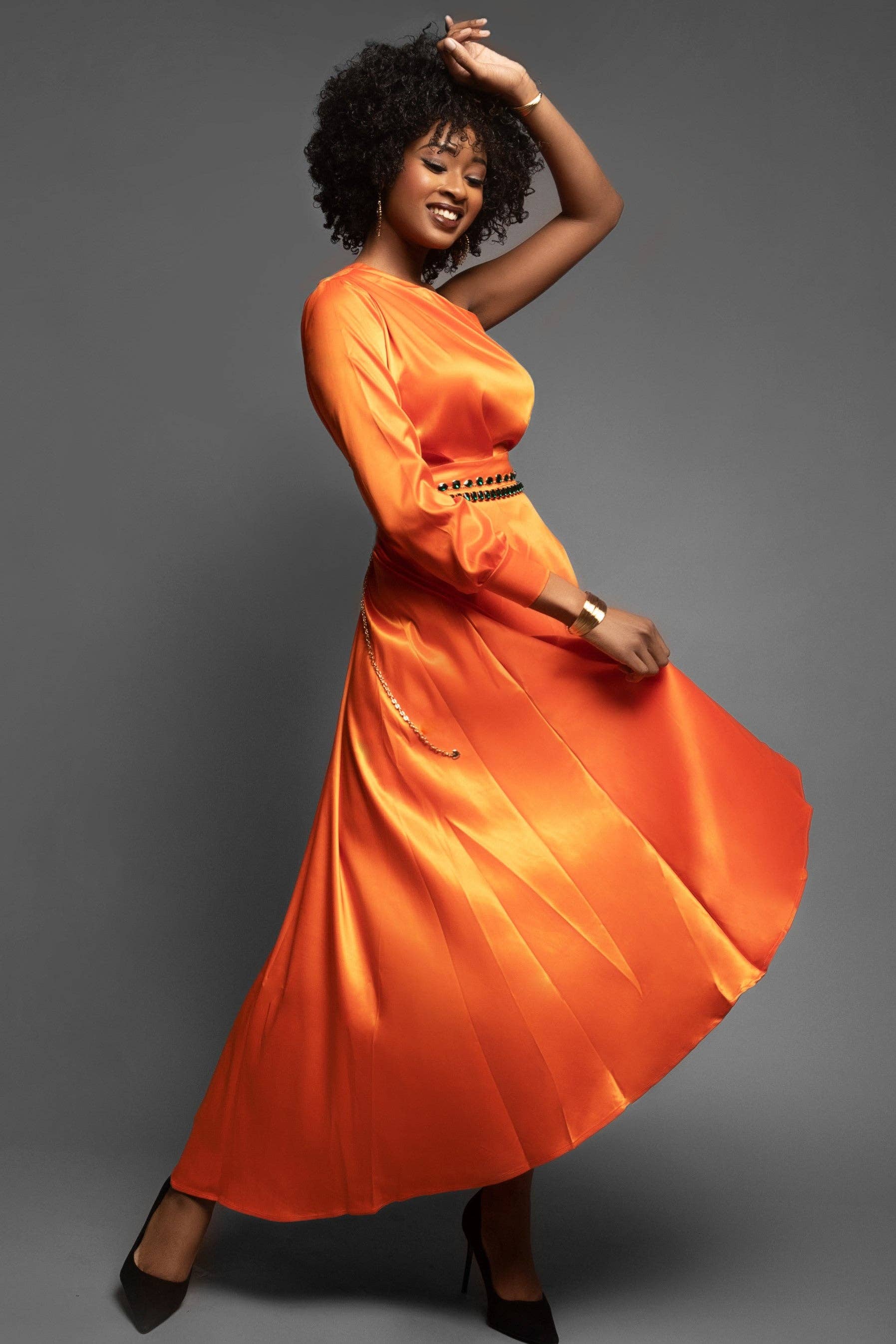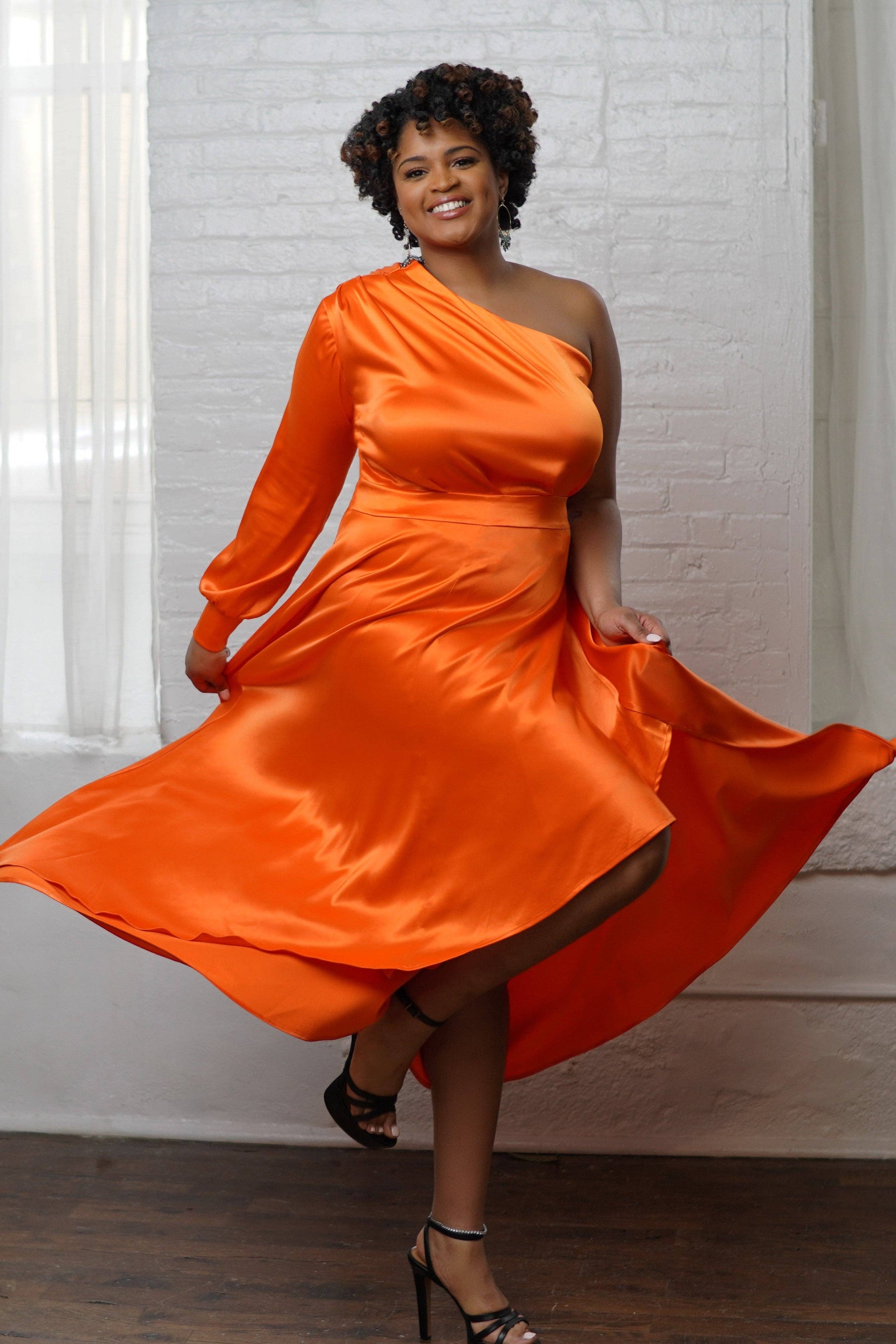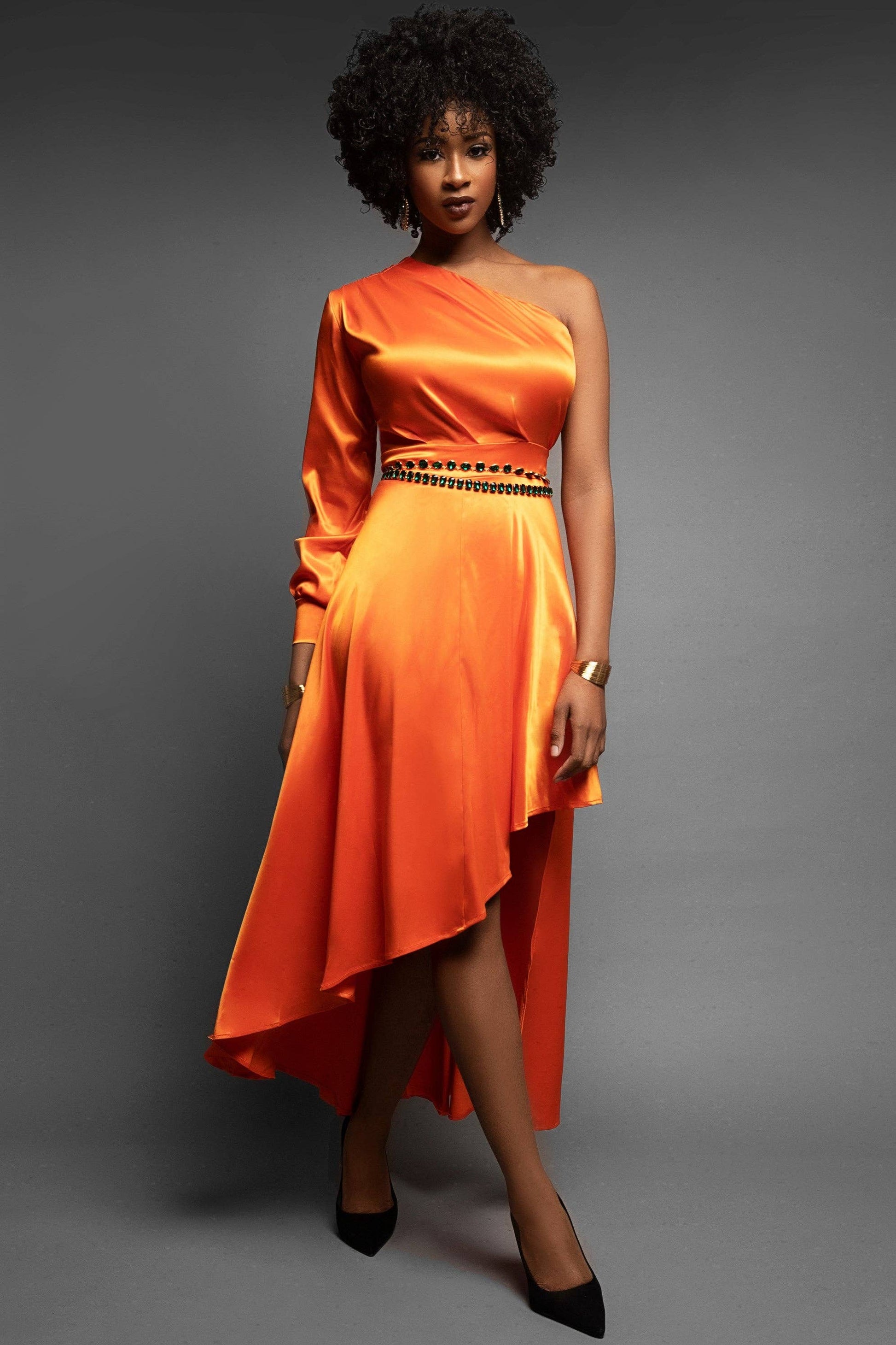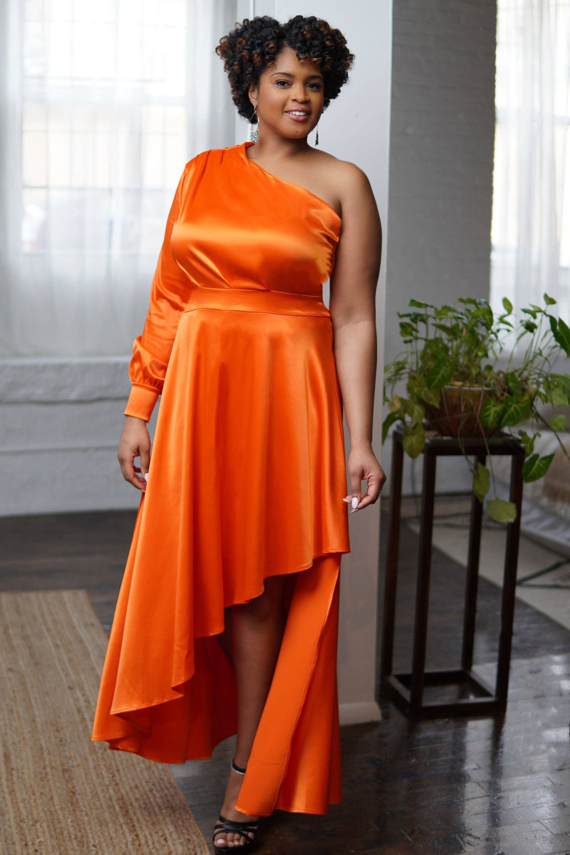 Camelia Orange Satin One Shoulder Hi Lo Maxi