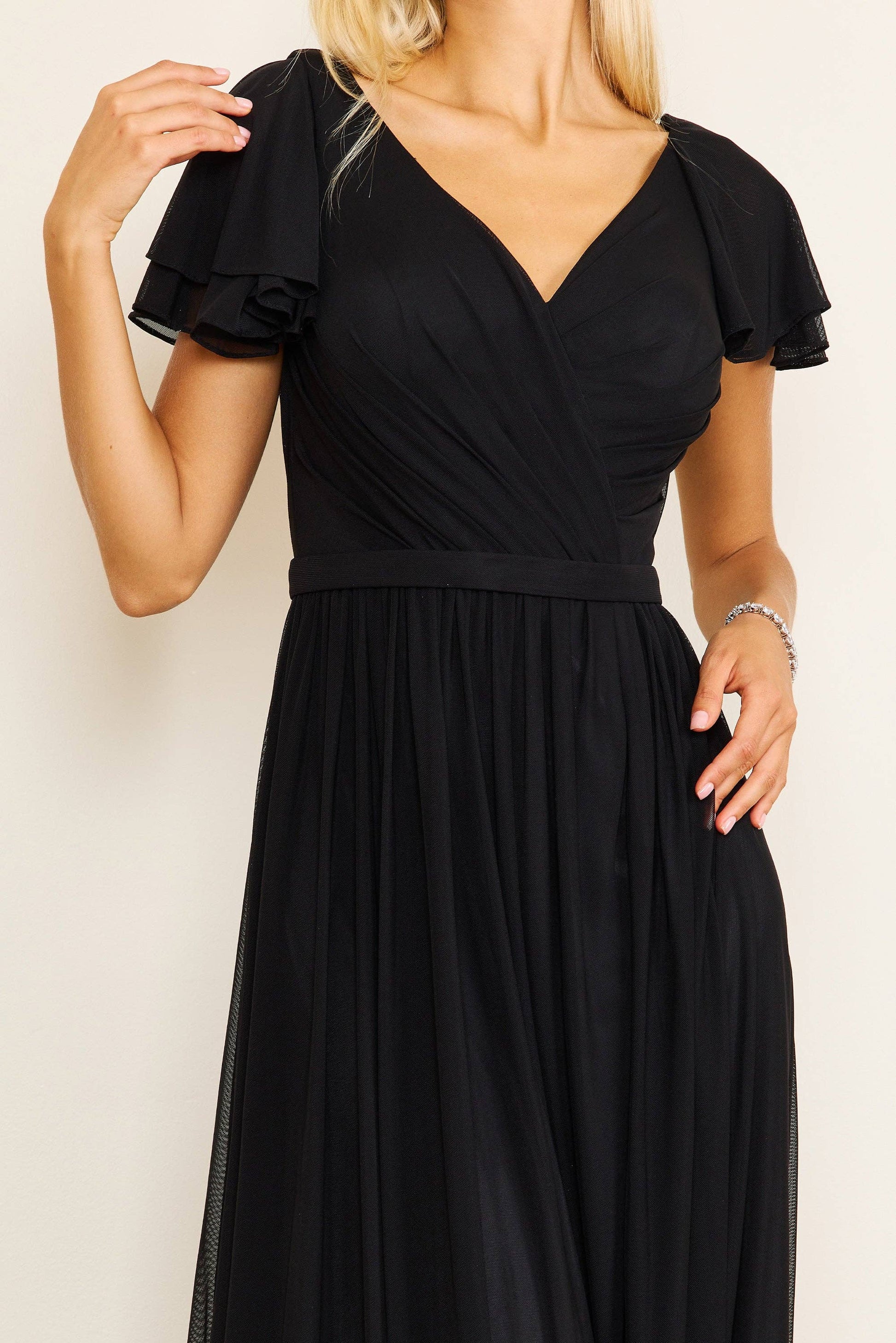 Indulge in the luxurious softness of stretch tulle with this full-length, short-sleeved formal mother of the bride dress. In elegant black, it is perfect for any special occasion, from prom, wedding to any sophisticated event.