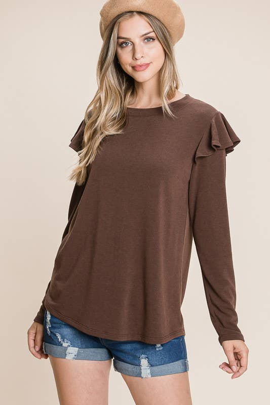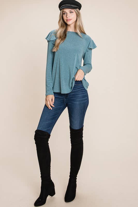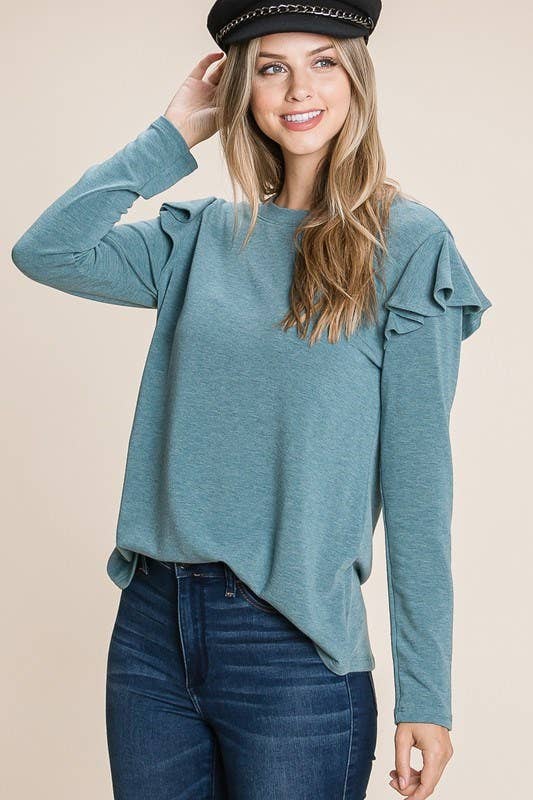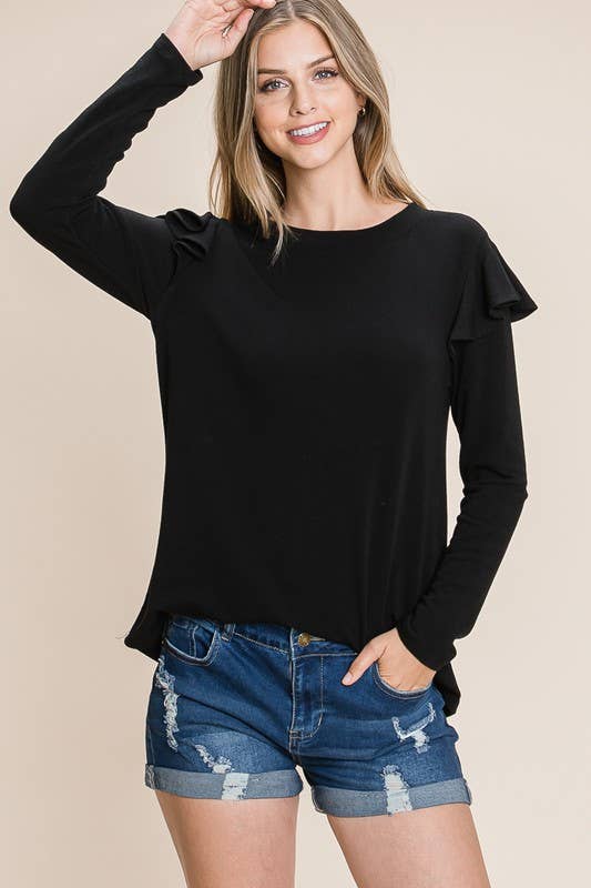 Solid French Terry Long Sleeve Casual Top with Ruffle Shoulder Detail