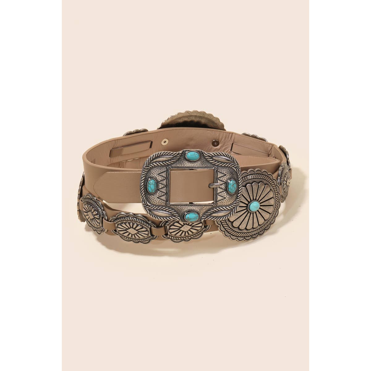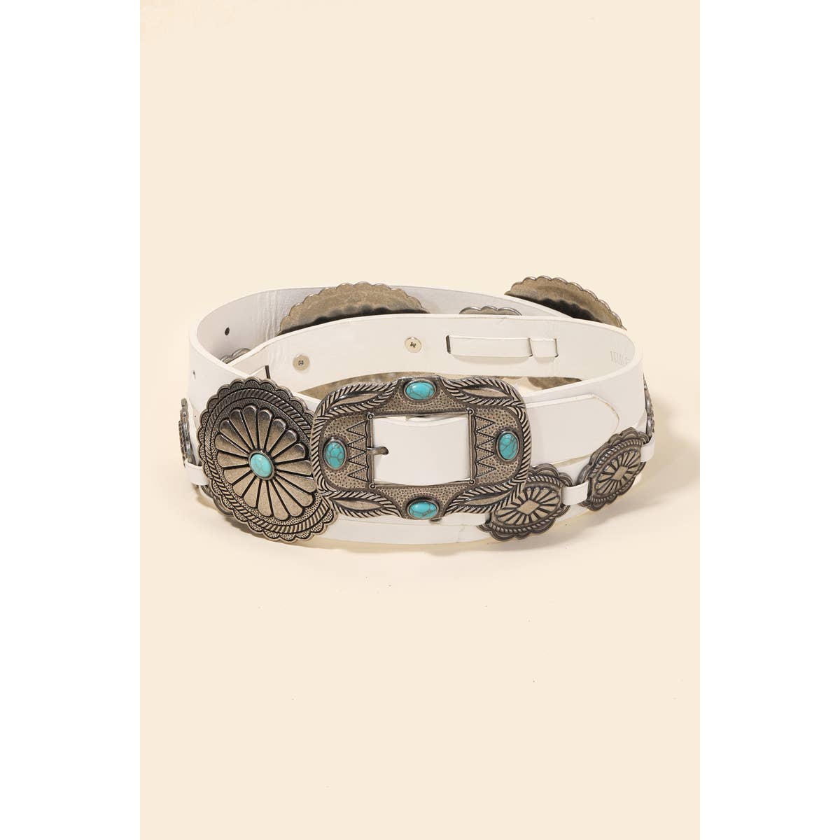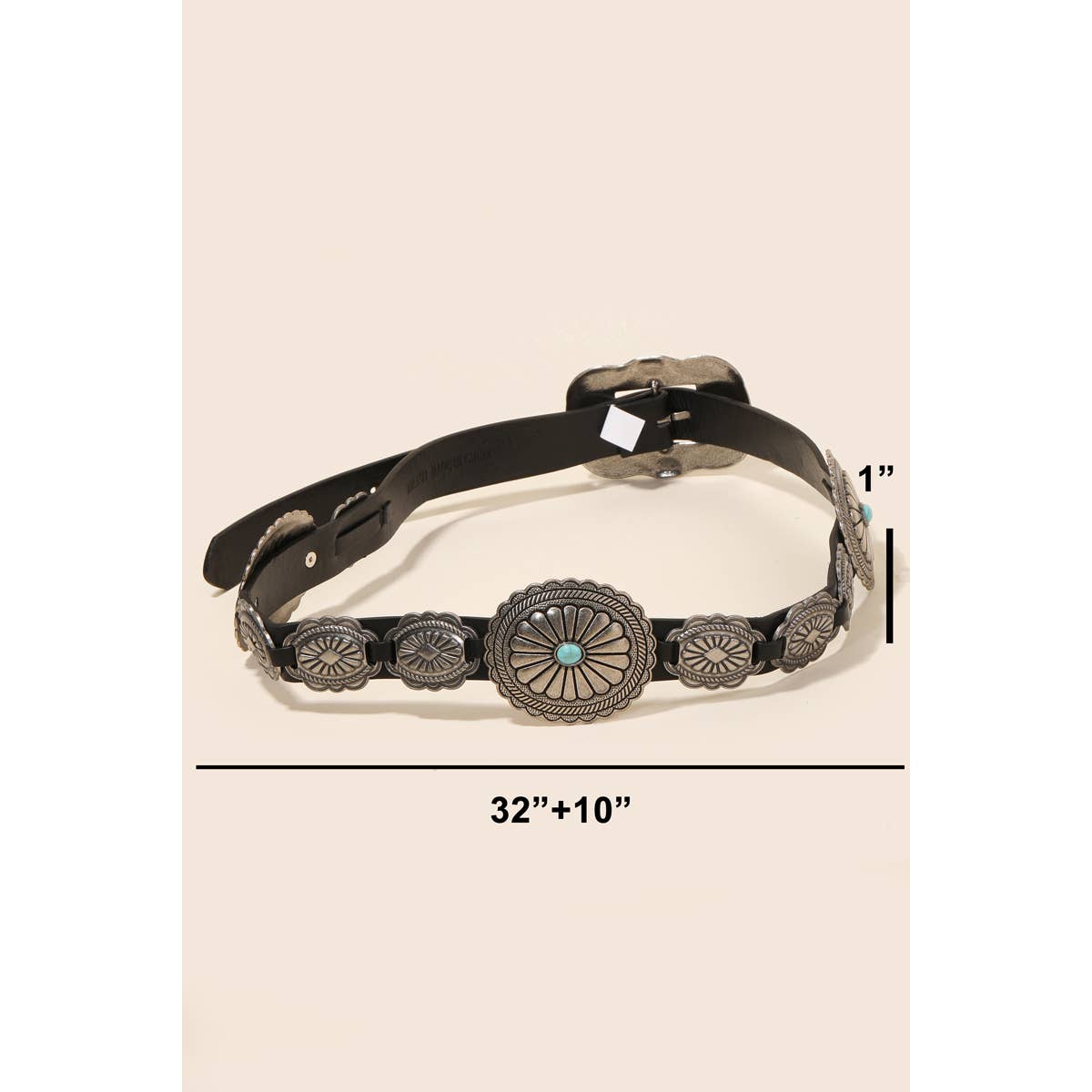 Complete your ensemble with a touch of elegance and sophistication with this dazzling Faux Leather Concho Western Belt. Designed with sleek faux leather and adorned with concho accents, this 42-inch belt is the ideal accessory for any outfit, whether you're dressing up or keeping it casual. Available in luxurious Brown and Ivory colors, this belt is crafted using 100% Vegan Leather.