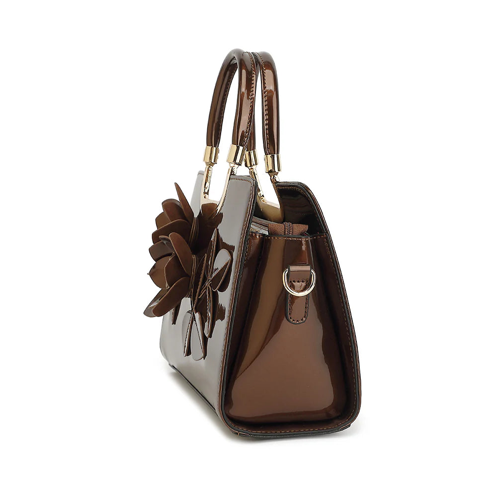 Carry your essentials in style with this striking floral patent leather satchel. The glossy finish catches the light beautifully, while the bold floral design adds personality to any outfit. Structured and spacious, it's perfect for work, shopping, or weekend adventures. The sturdy handles ensure comfortable carrying, and the polished leather develops a unique patina over time. A versatile accessory that transitions seamlessly from day to night.