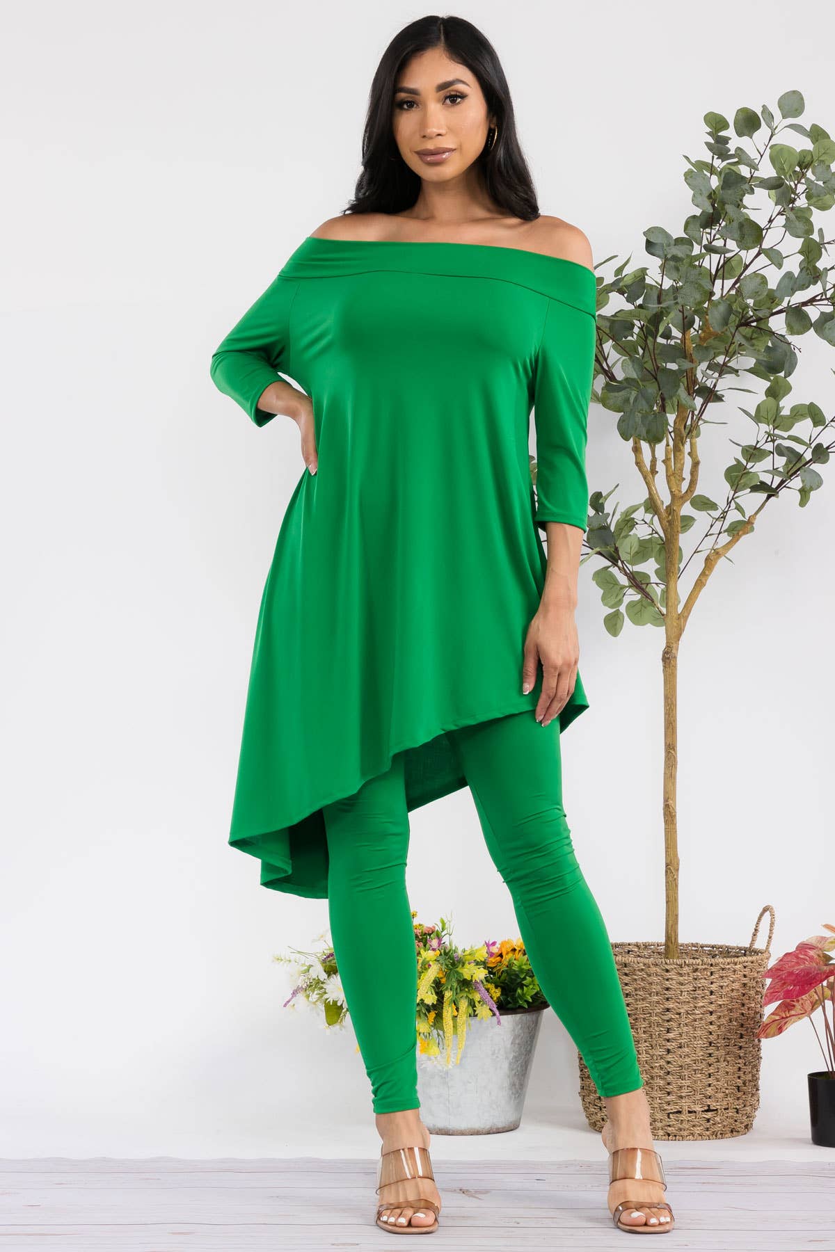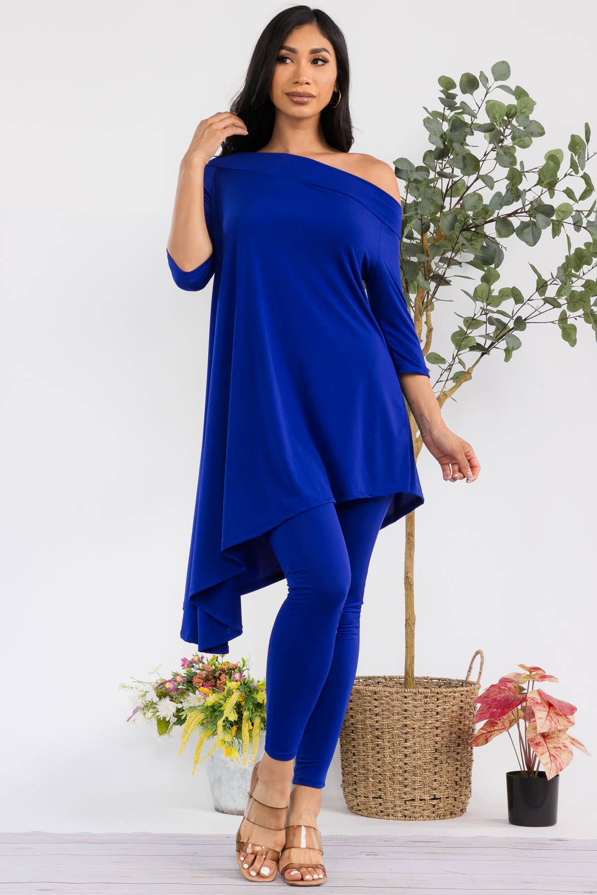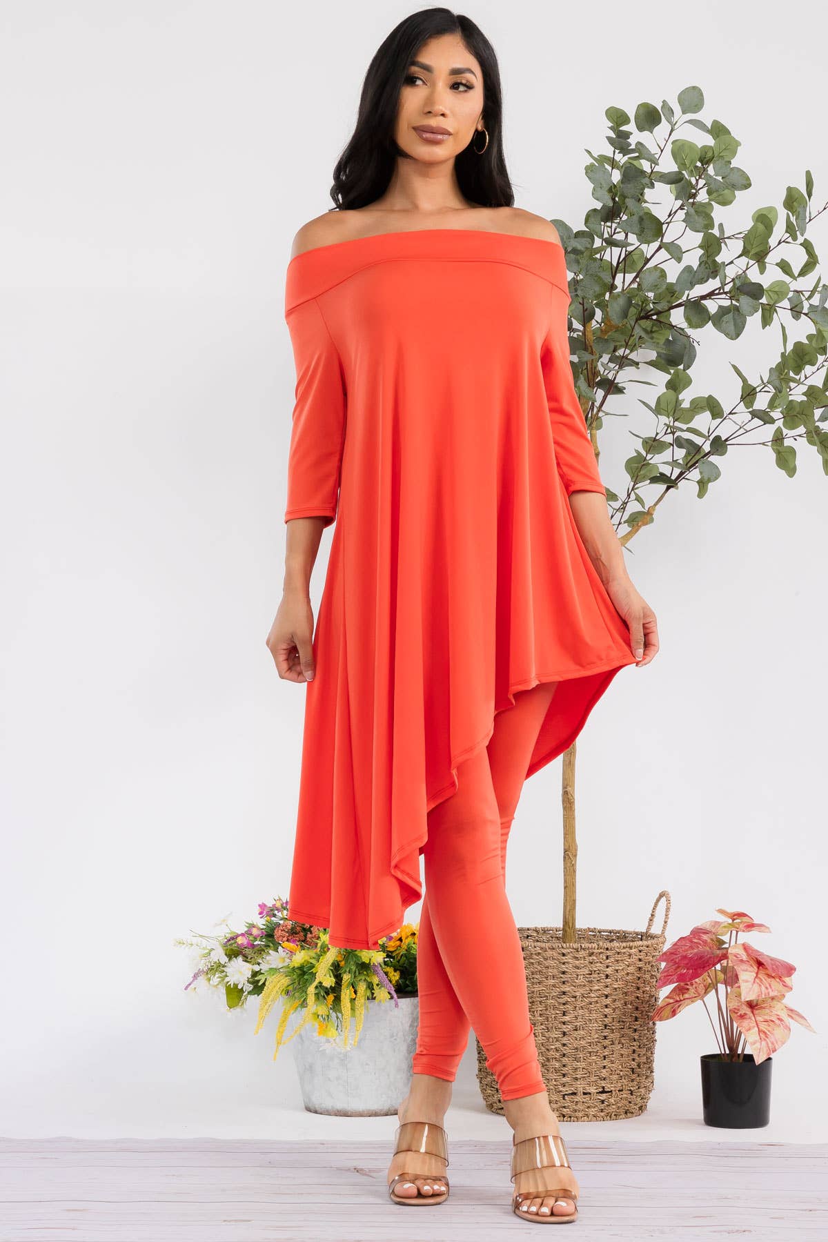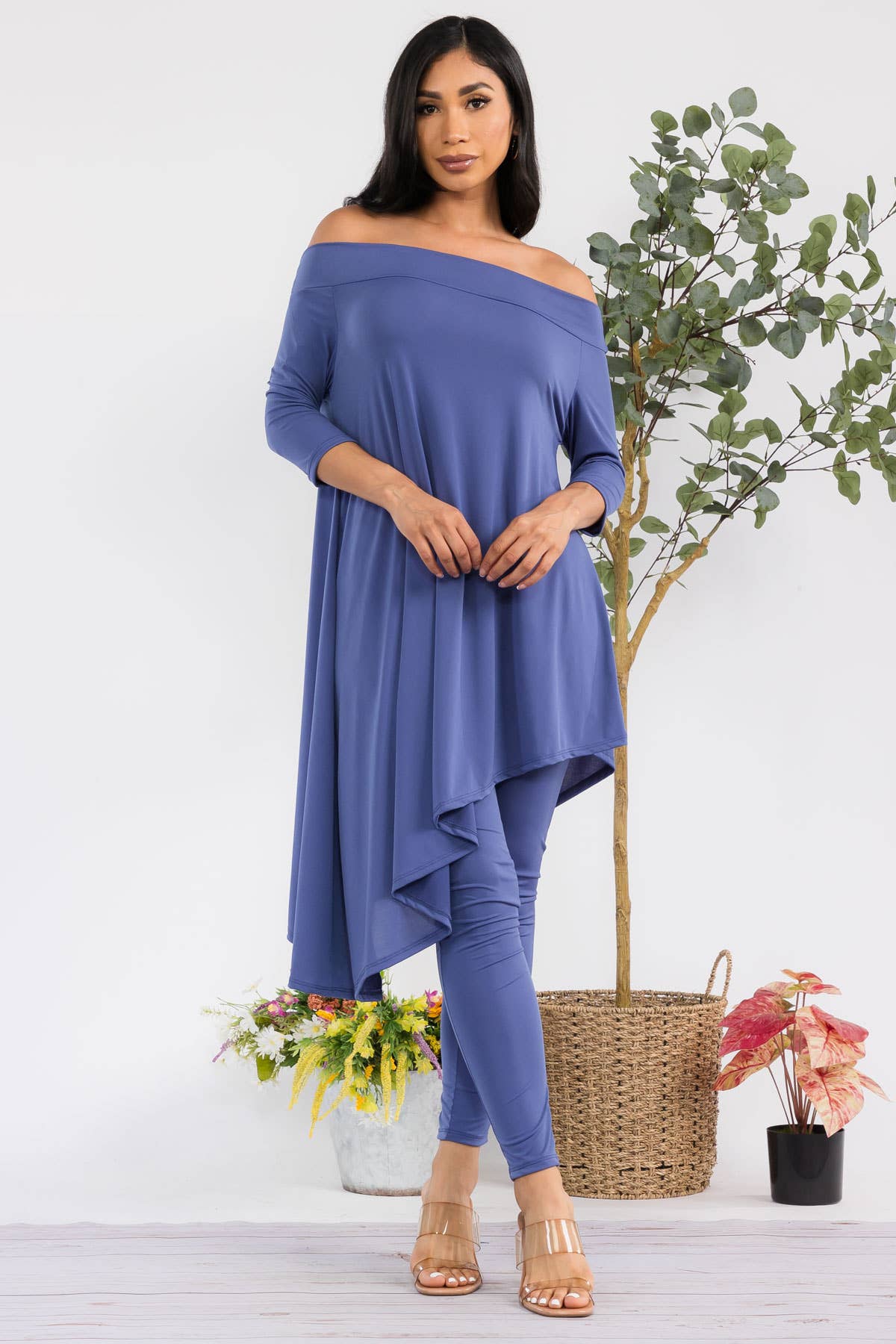 - Asymmetrical hem - Off shoulder - 3/4 sleeve - High waist Effortlessly stylish and versatile, this set is perfect for any fashion-forward individual. With its asymmetrical hem and off shoulder design, it offers a modern twist on classic silhouettes. The 3/4 sleeve and high waist add a touch of sophistication, making this the perfect choice for any occasion. ITY FABRIC 95% Polyester | 5% Spandex | Made in the U.S.A.