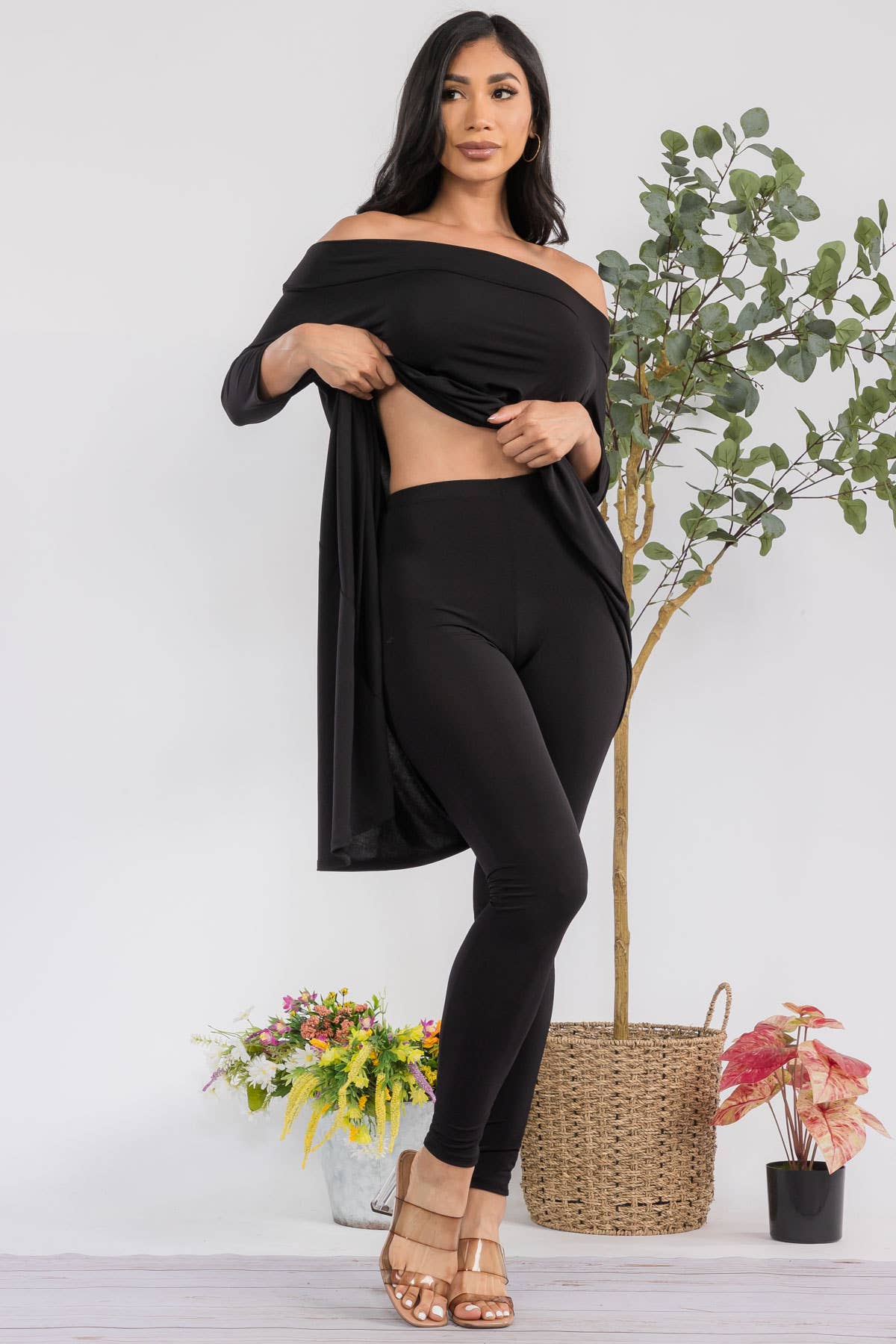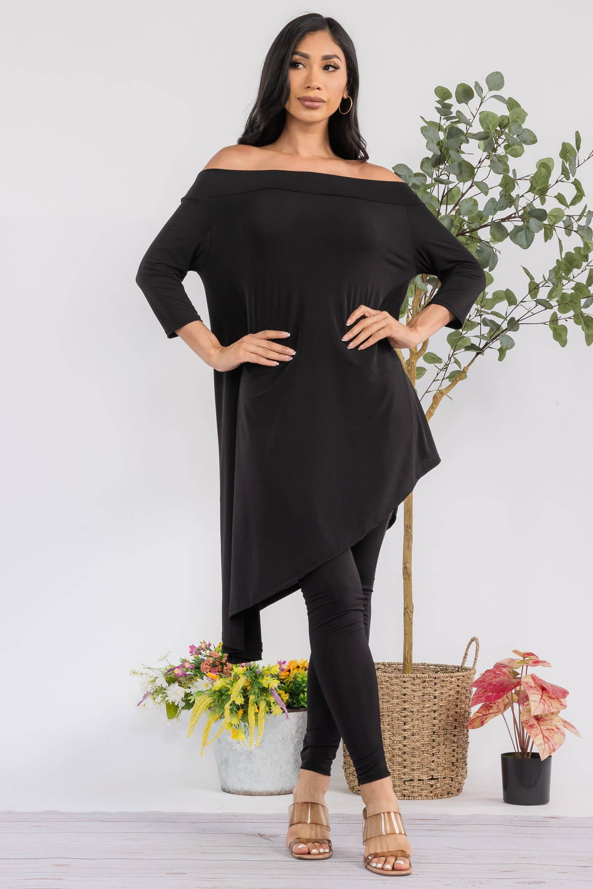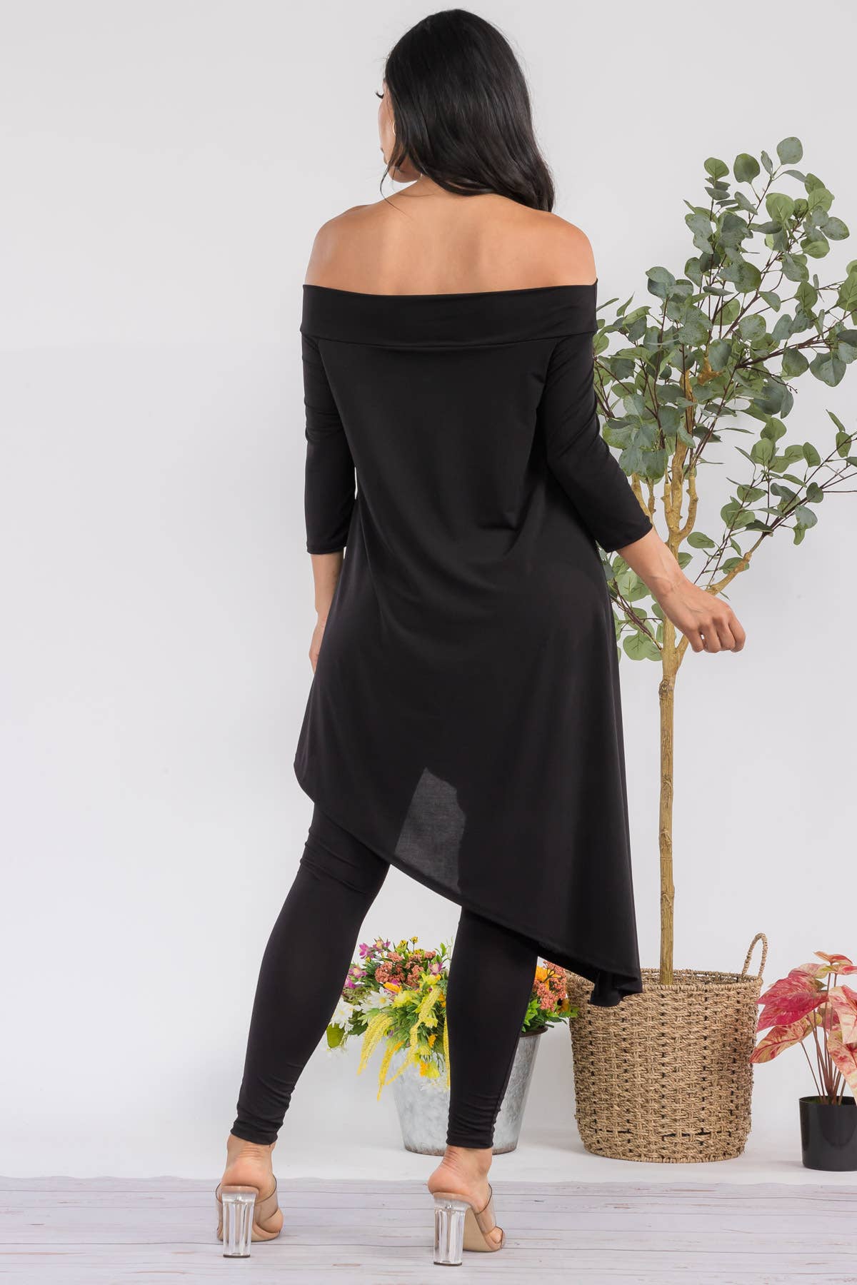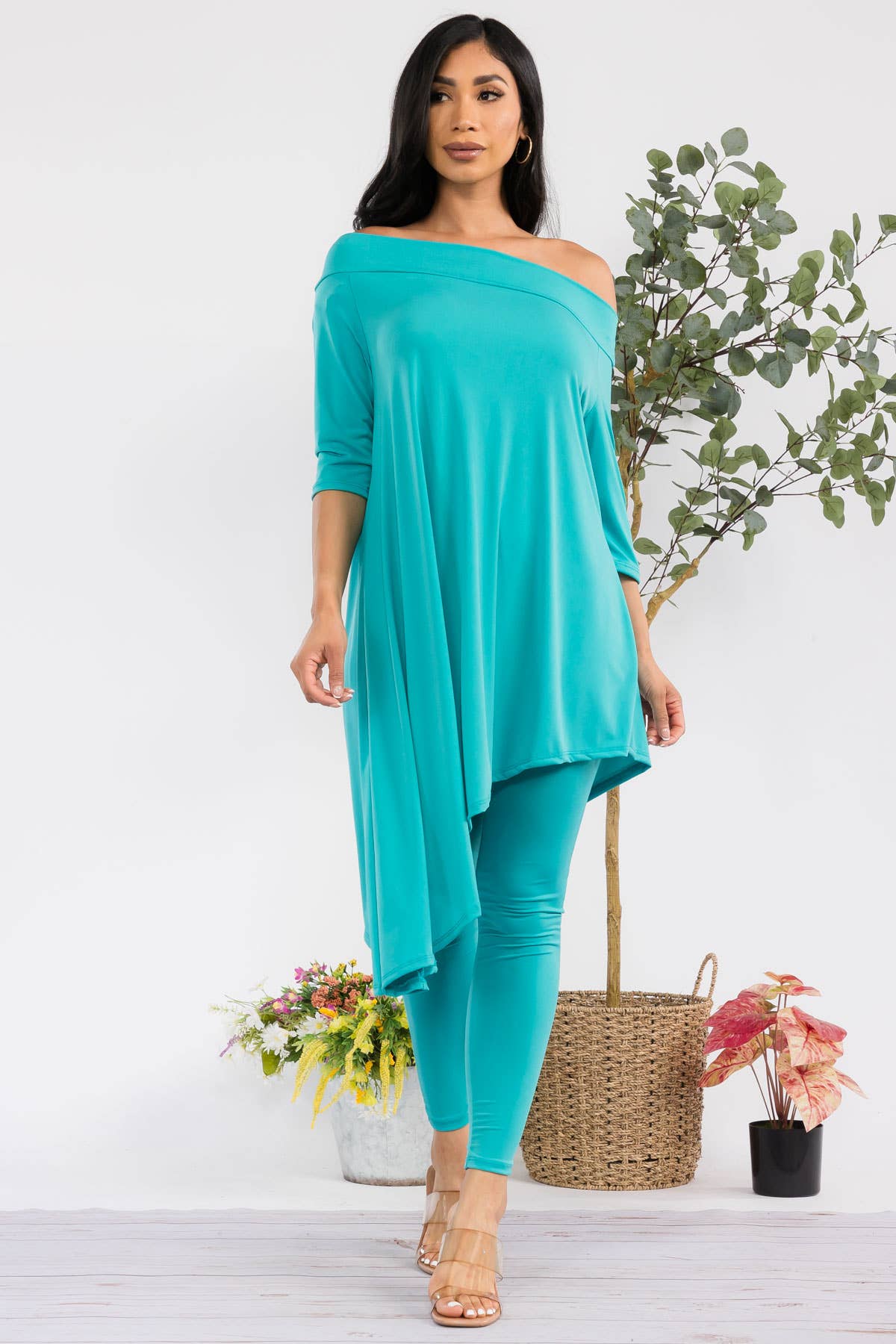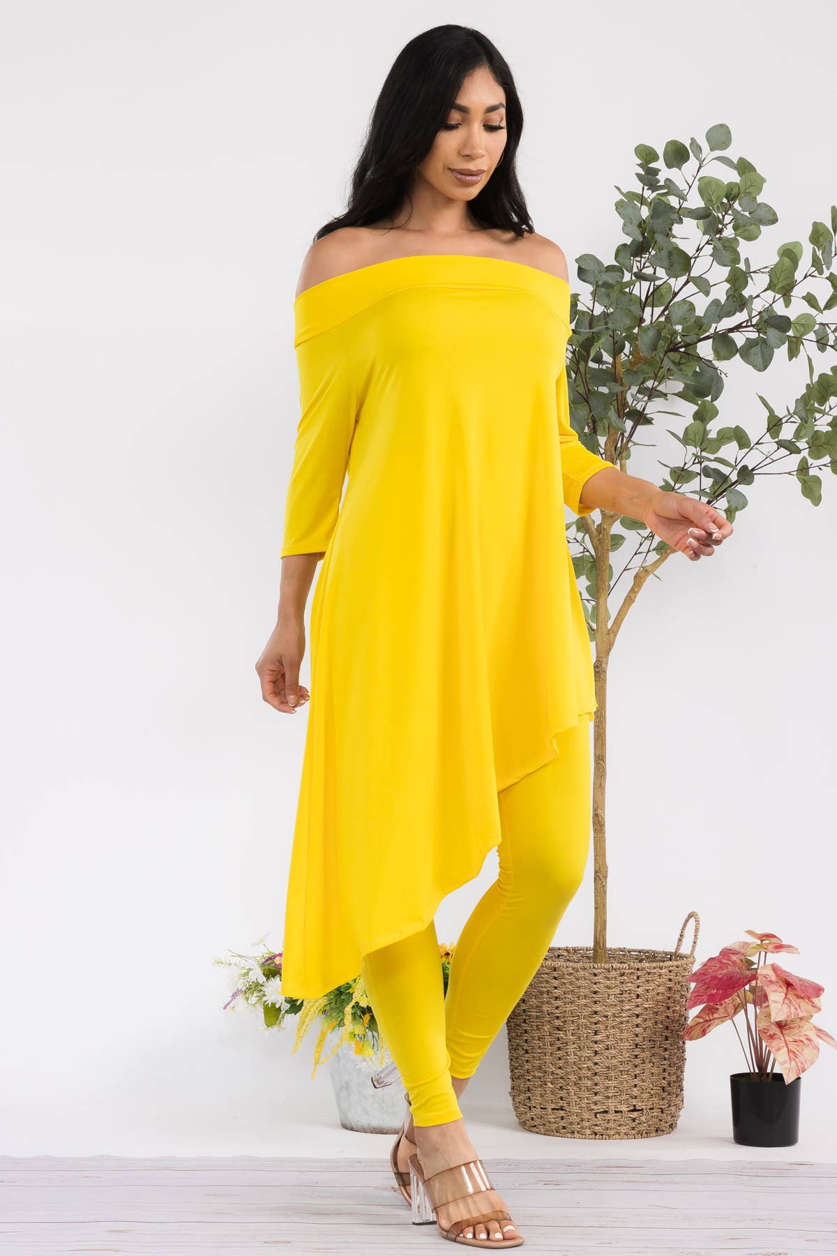 - Asymmetrical hem - Off shoulder - 3/4 sleeve - High waist Effortlessly stylish and versatile, this set is perfect for any fashion-forward individual. With its asymmetrical hem and off shoulder design, it offers a modern twist on classic silhouettes. The 3/4 sleeve and high waist add a touch of sophistication, making this the perfect choice for any occasion. ITY FABRIC 95% Polyester | 5% Spandex | Made in the U.S.A.