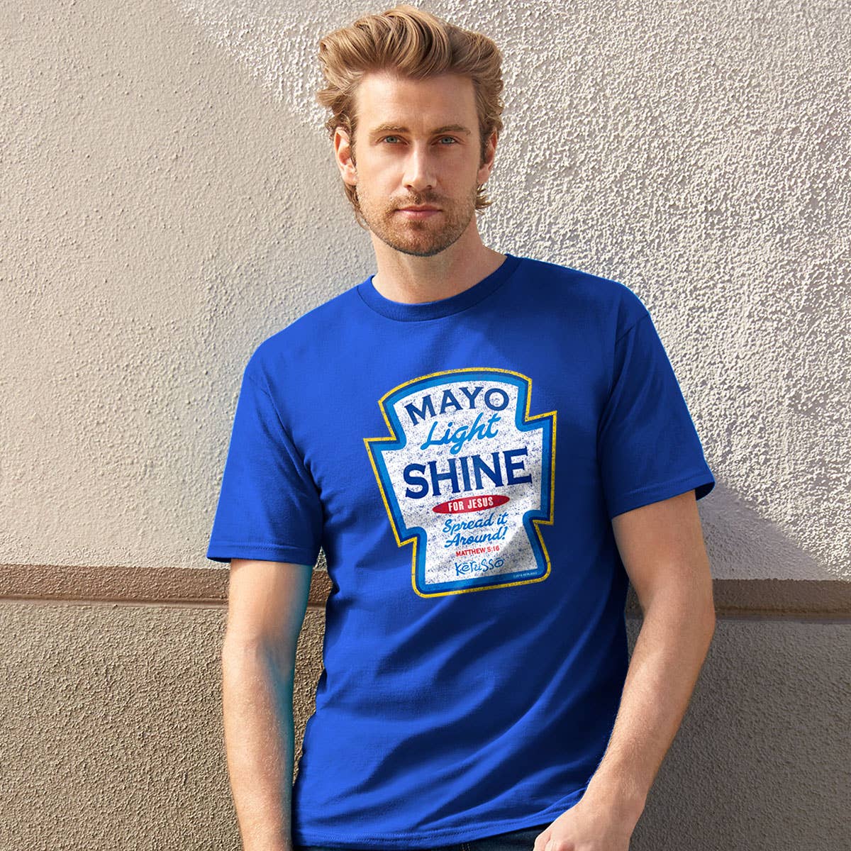“Mayo Light Shine” is a fun take on ‘may your light shine' in this Kerusso® Adult T-Shirt - Mayo Light Shine in Royal Blue, a zesty addition to the popular lineup of condiment-inspired tops. This unisex shirt will be the star of your picnic, barbecue, or casual Friday. It's a quirky reminder to shine the light of faith wherever you go, and sure to be one of your favorites.