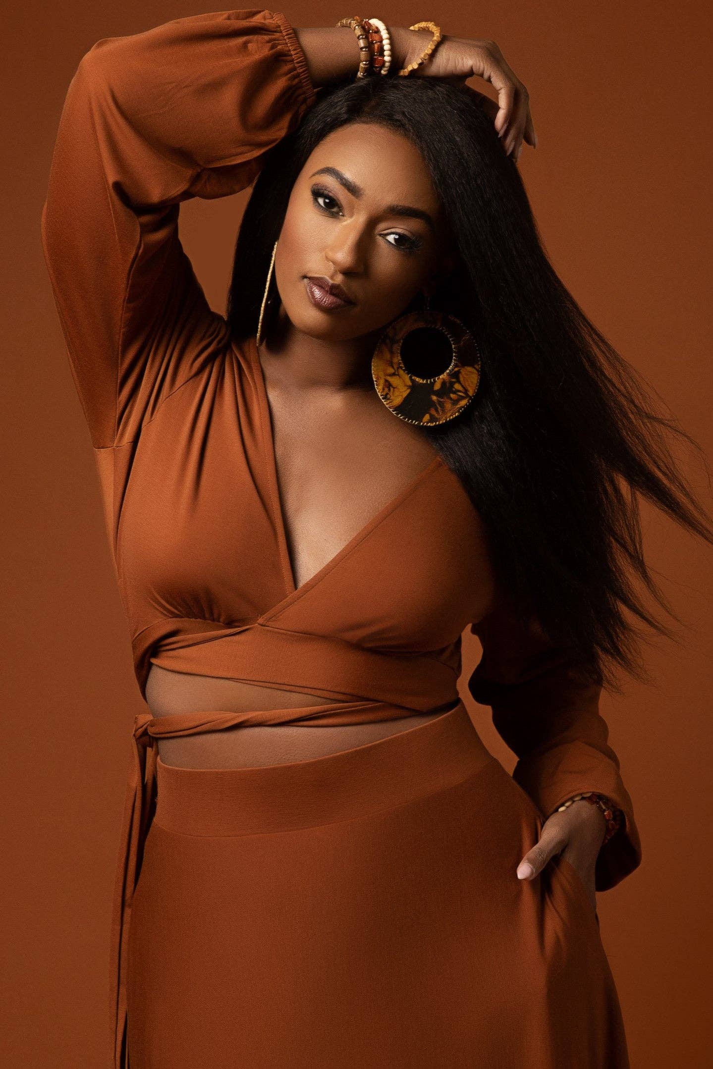EXCLUSIVELY DESIGNED BY US FOR YOU. The Nadia set is a wrap top and knit maxi skirt set with a touch of chic. Super soft and stretchy material that fits your curves in all the right places. High waisted full maxi skirt. Paired with a wrap top with long sleeves.