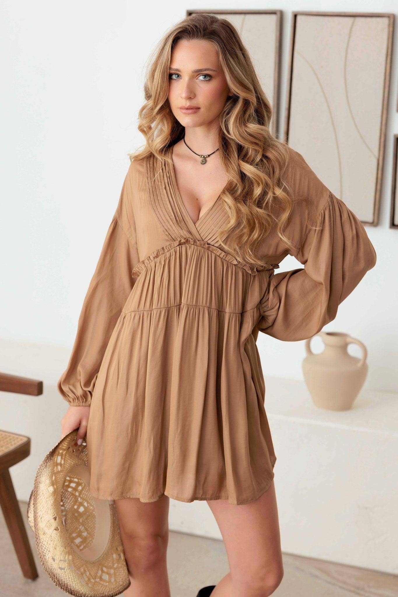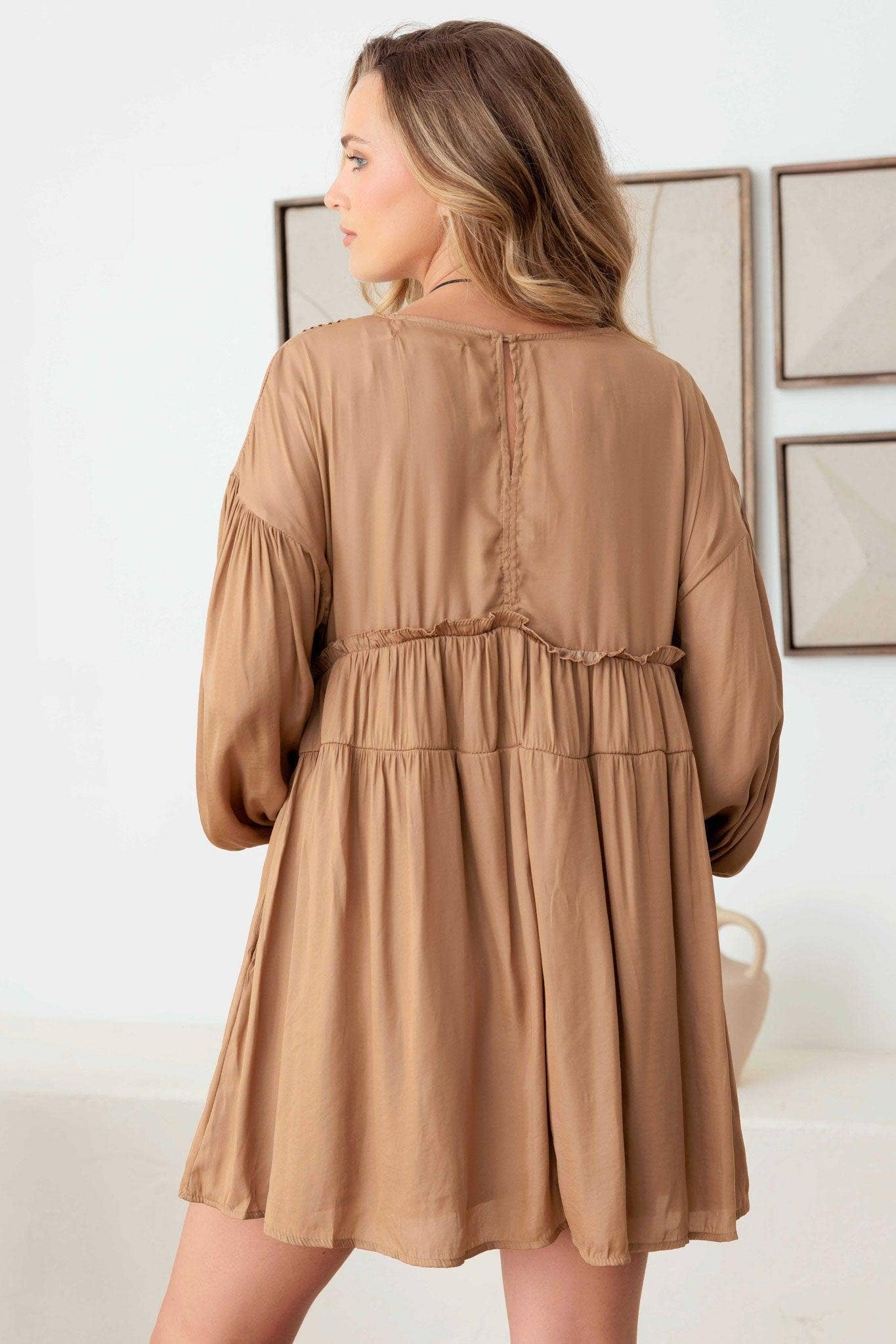 women dress, v with pleated neckline, balloon sleeve with elastic wrist, double side pocket, ruffle detail empire waist, fully lined, button back keyhole closure, double side pocket, silk like material, scoop front and back hemline, flowy, oversized fit and prefect bohemian
