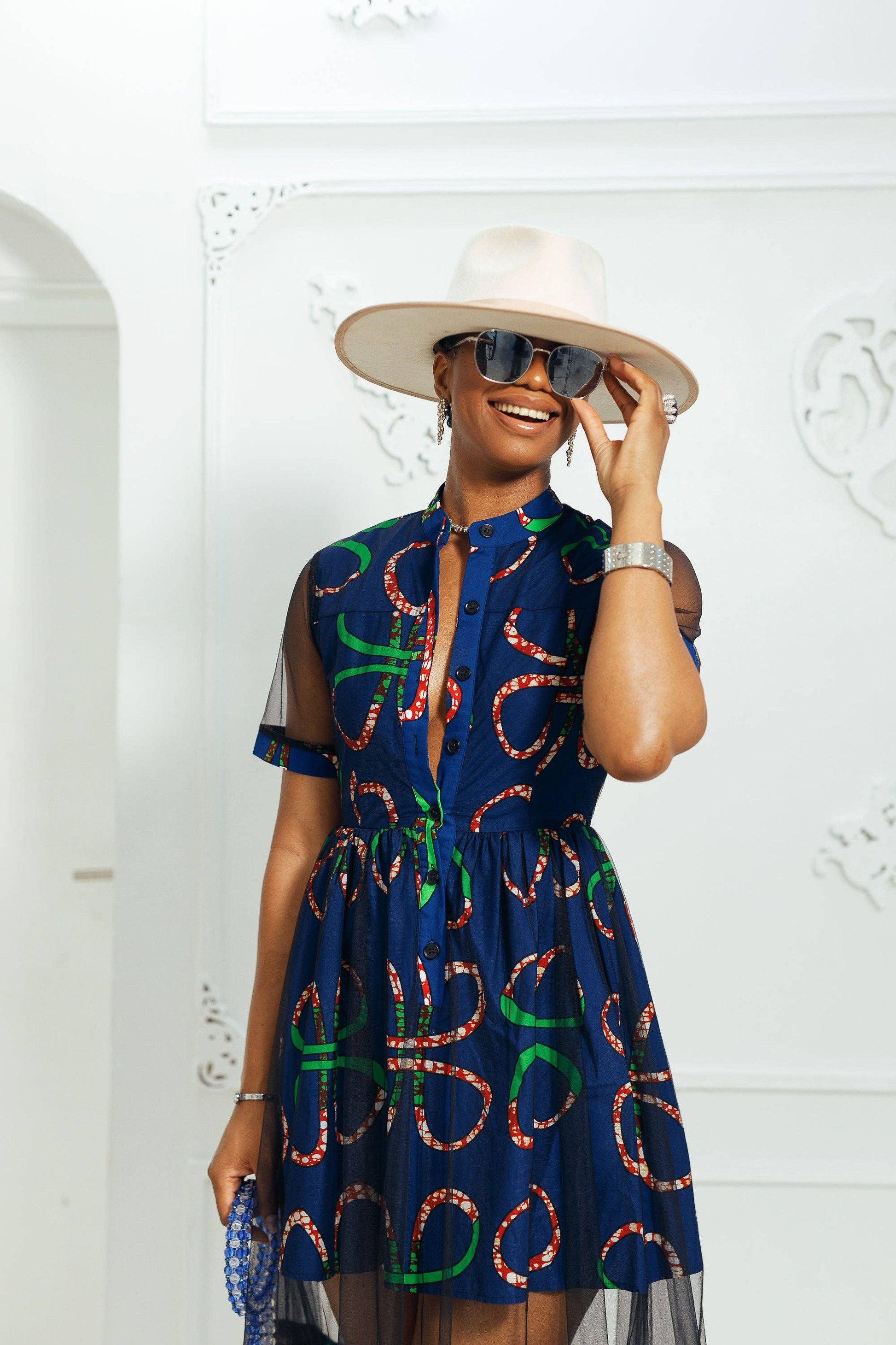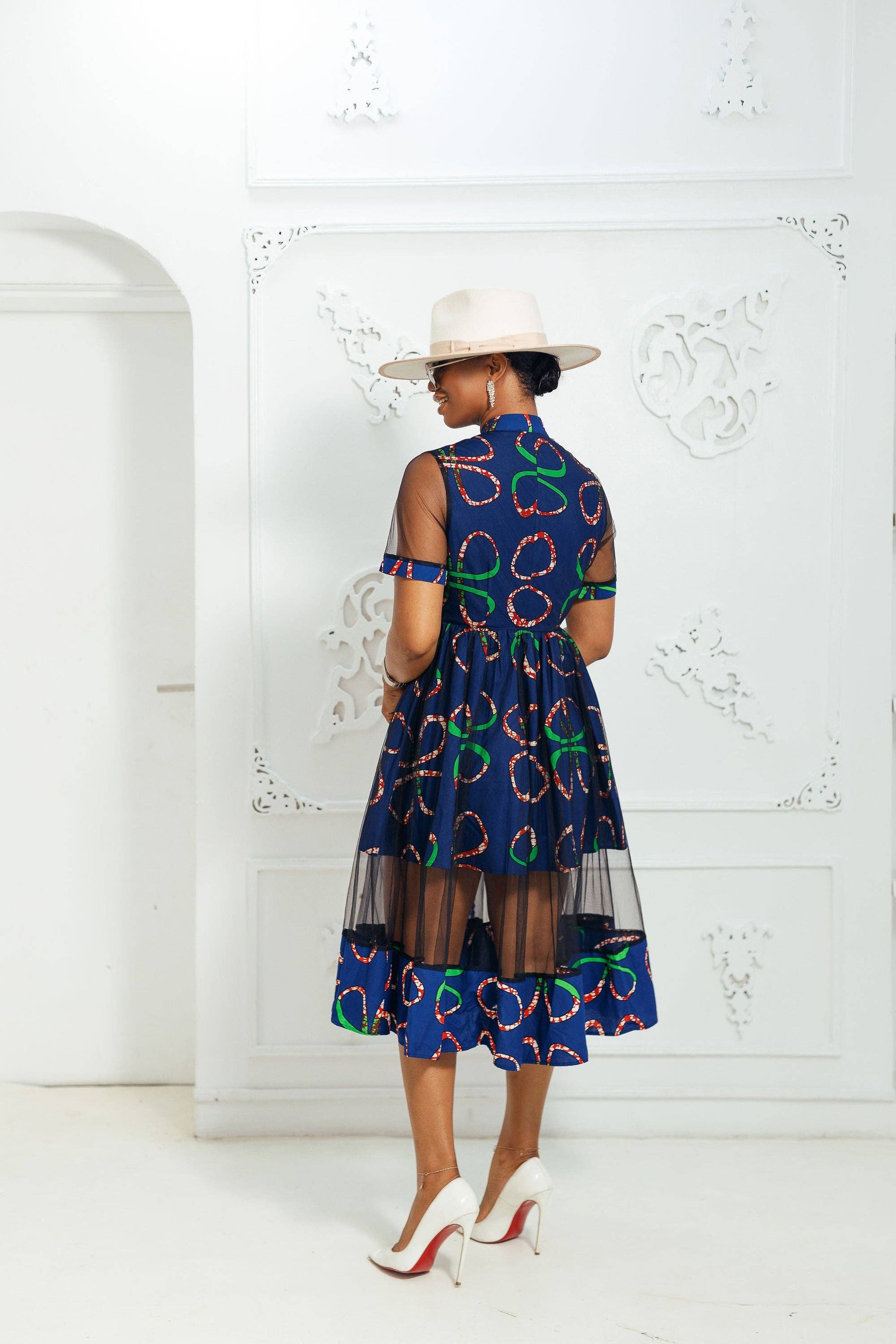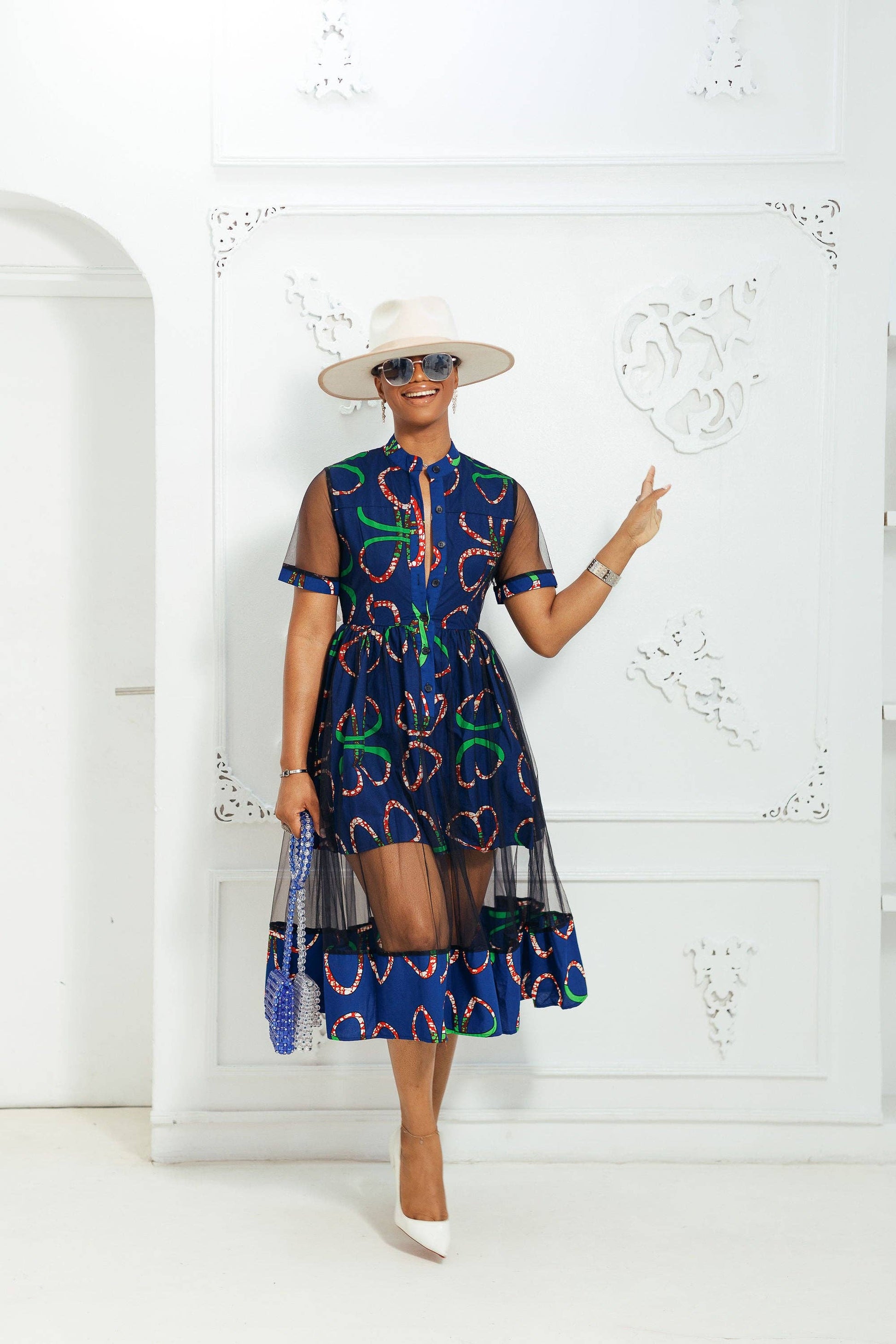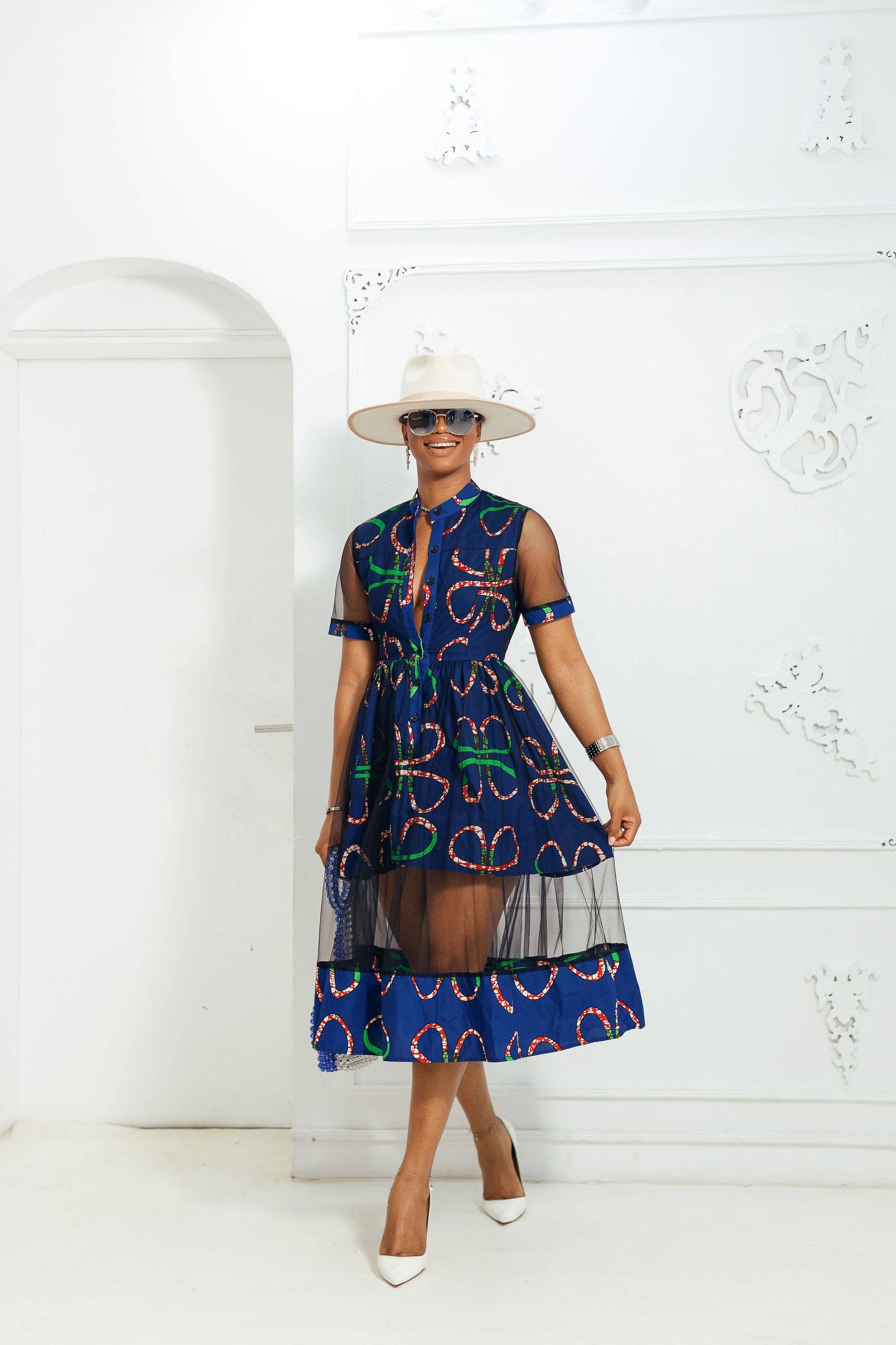 This VALENTINA African Print Button Mesh Dress is the perfect statement piece! The unique outer mesh adds an edgy touch, while the underlay of African fabric provides a glamorous look. With this dress, you'll turn heads and be the life of the party. Unleash your inner fashionista with this stunning dress that combines both style and sass.