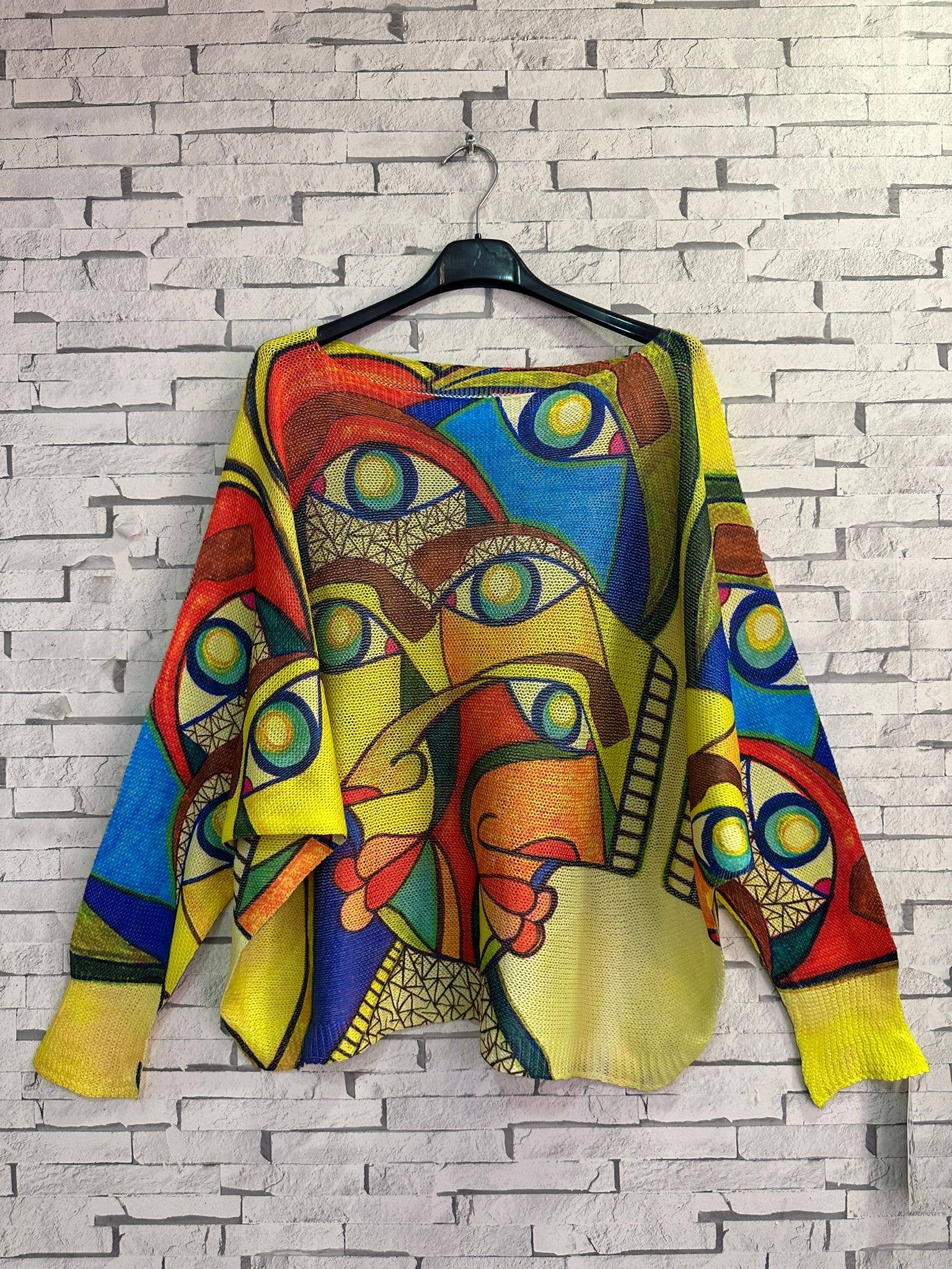 Yellow "Picasso" Round Knit Printed Sweater A true work of art, this Yellow "Picasso" Round Knit Printed Sweater elevates your wardrobe with its intricate design and luxurious materials. Crafted with the finest yarns and featuring a bold print reminiscent of Picasso's famous works, this sweater is a statement piece that exudes sophistication and exclusivity. With its soft knit texture and flattering round neckline, it's a comfortable and stylish choice for any occasion. Add a touch of high-end fashion to your closet with this masterpiece of a sweater. LOOWIE One Size Made in Italy 62% Polyester 33% Viscose 5% Elastane